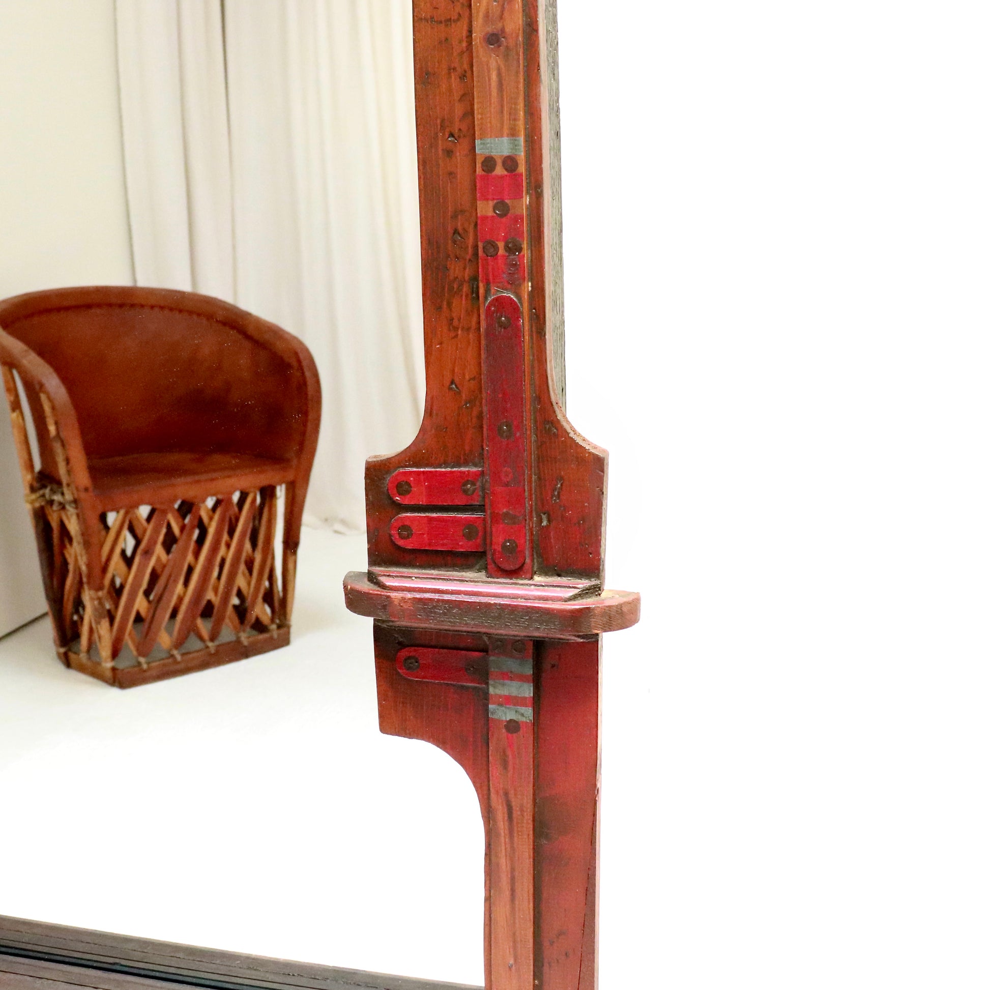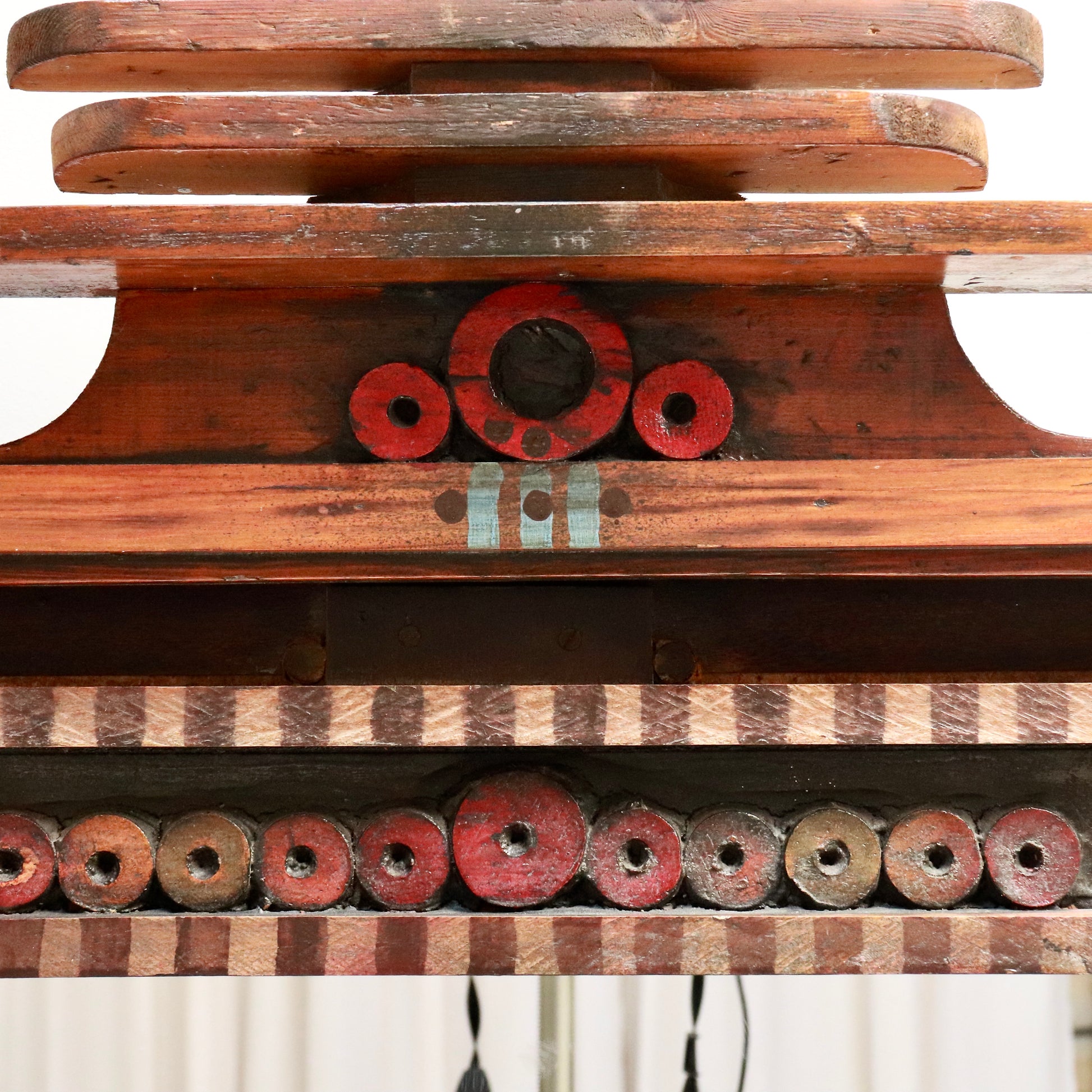 The oversized frame features layered fretwork, hand-notched corners, geometric cutouts and a canopy-like crest, all rendered in warm red-brown tones with subtle accents in black and faded blue. The paint is worn and patchy in places, giving it the dry, matte surface of a desert trading post. There’s a totemic quality to the whole, as if it belongs in a pueblo, a saloon, or the dream set of a Jim Jarmusch film.