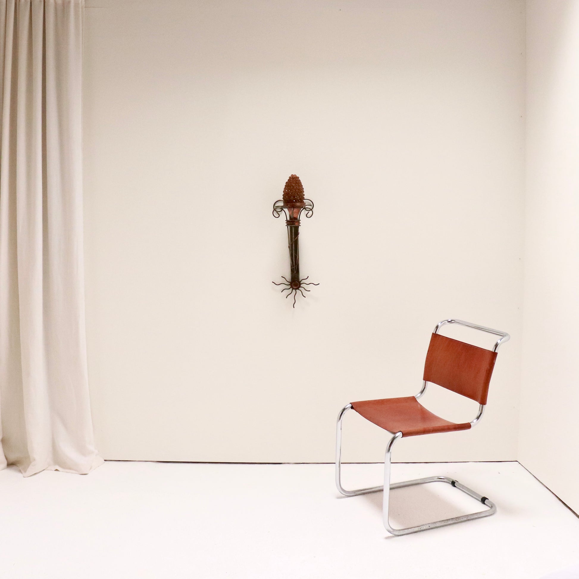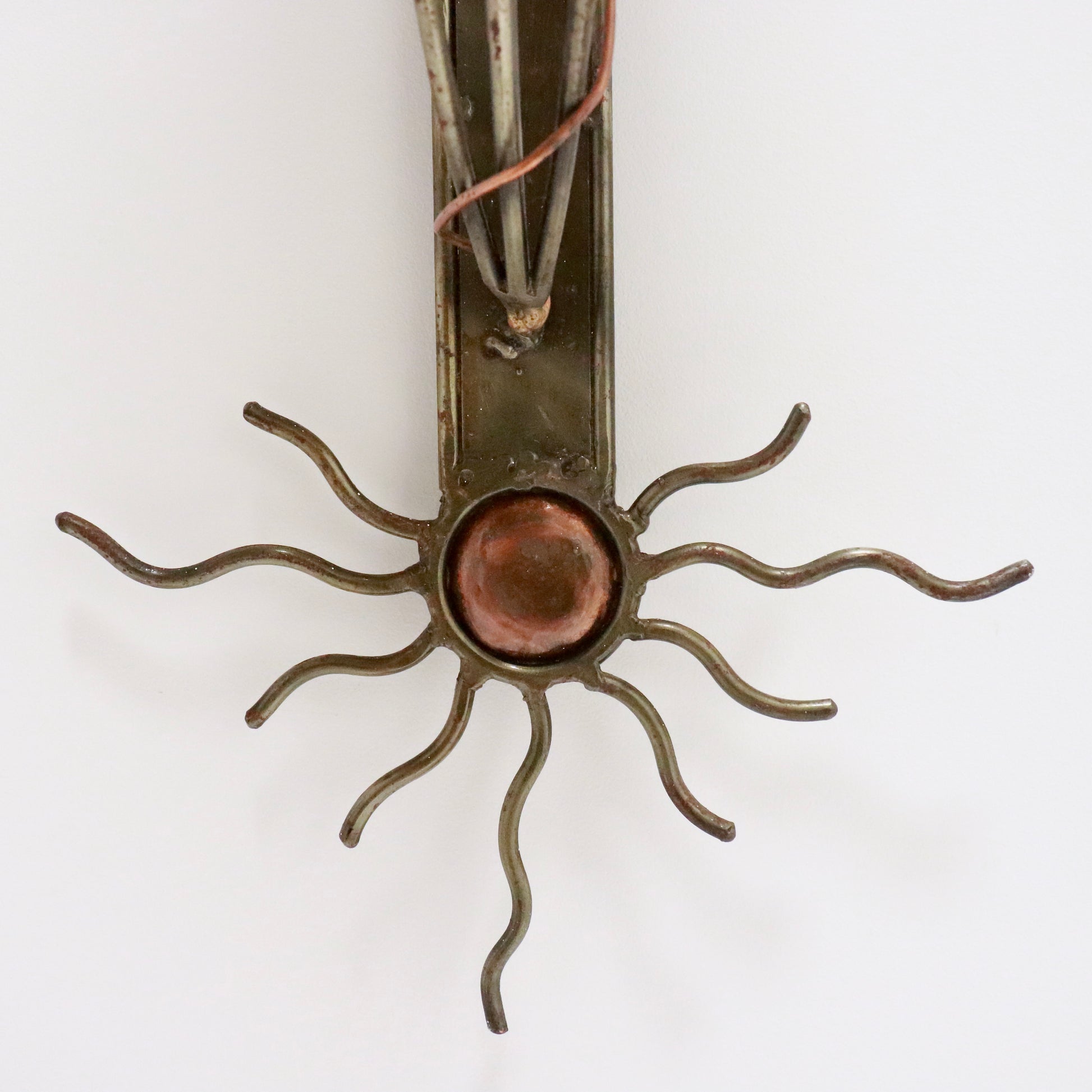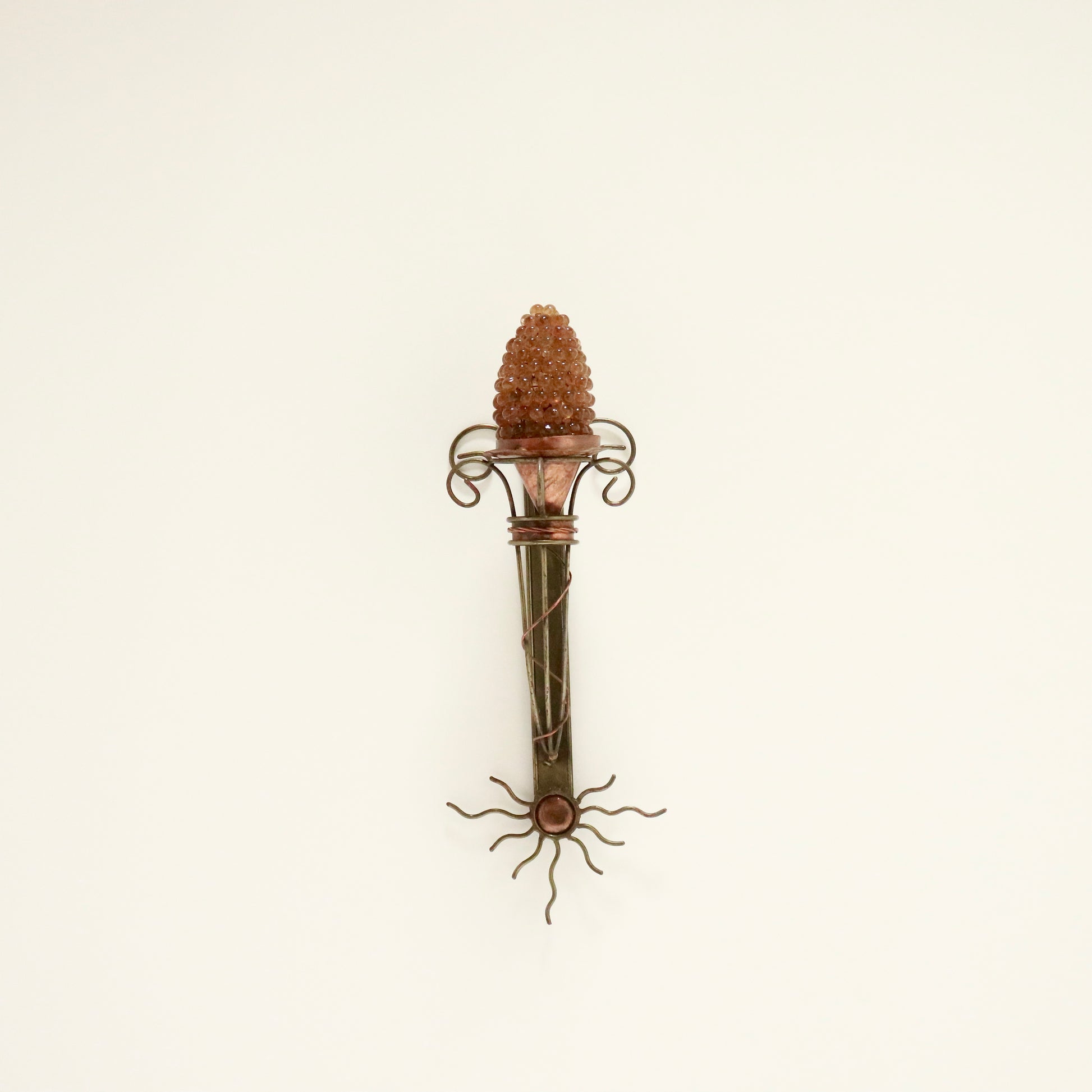 A spirited and singular artisan wall light, wrought in iron and copper with a fantastical hand-blown glass shade in the form of a grape cluster. Part torchère, part sunburst shrine, it evokes folkloric ritual and Mediterranean exuberance in equal measure.