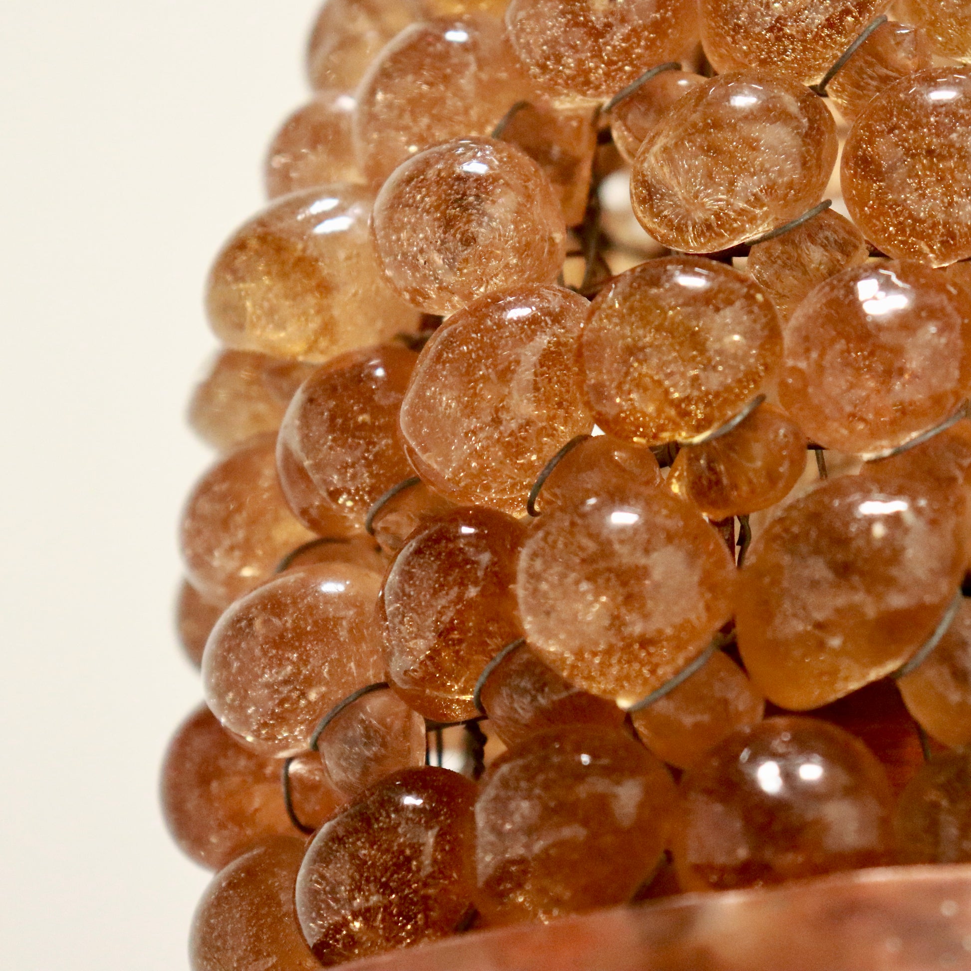 The frame is forged and twisted by hand—scrollwork, sun motifs, and coiled copper elements converge in a kind of sculptural dance. The glass shade is a dense cluster of amber grapes, richly textured and glowing when lit. A celebration of material and invention, somewhere between surrealist lighting and agrarian icon.