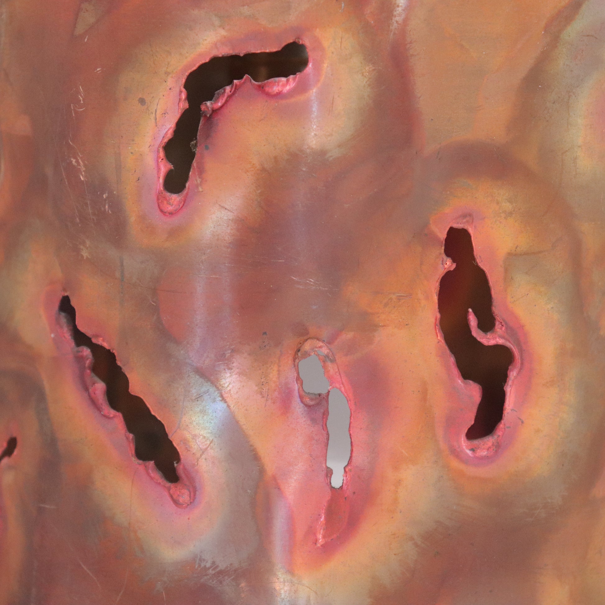 An elemental pendant light, crafted from hand-worked copper and wrought iron. The cylindrical shade bears a rich, heat-patinated surface, alive with molten hues of red, bronze, and ember. Torch-cut perforations scatter across its form like organic fissures, allowing light to escape in glowing, volcanic fragments.