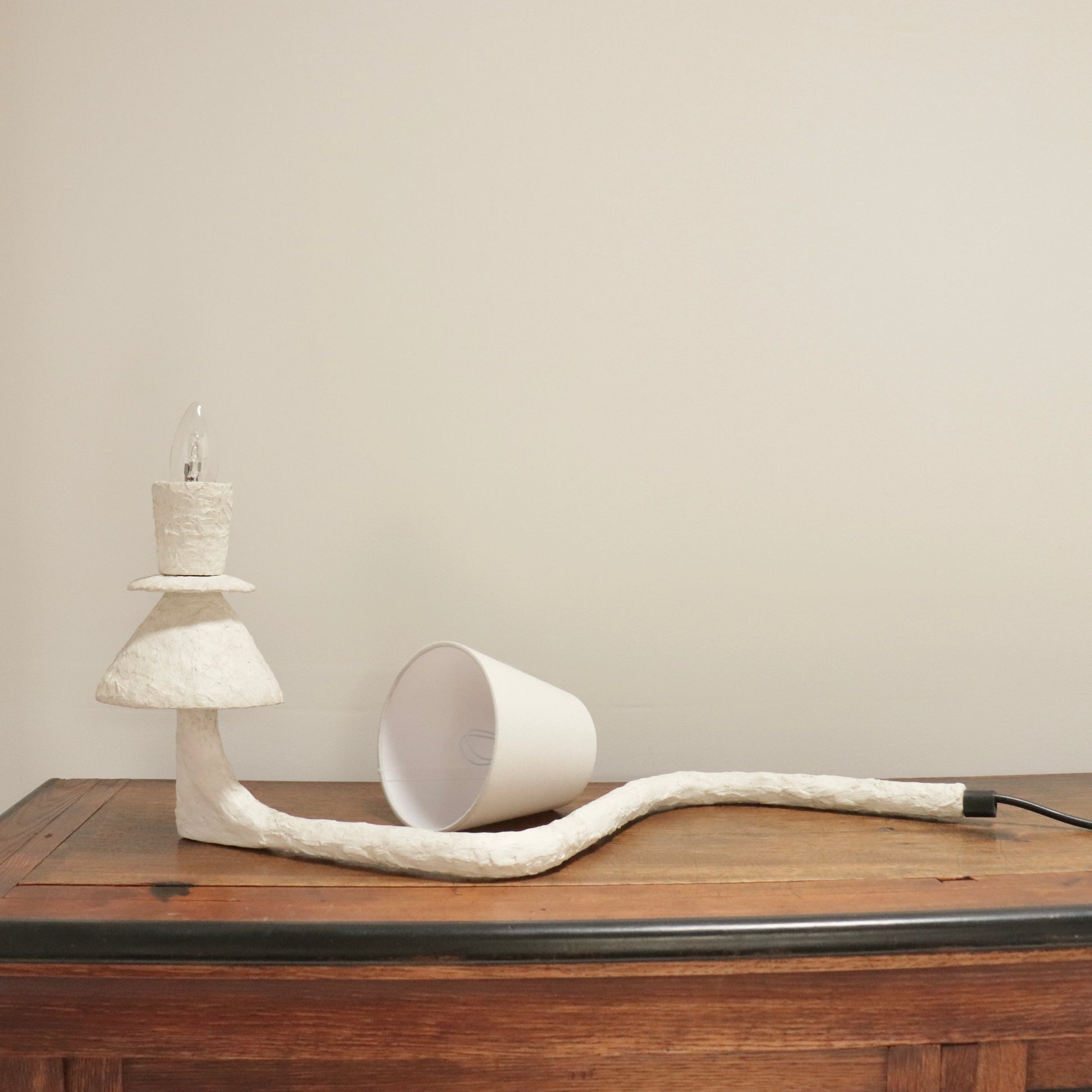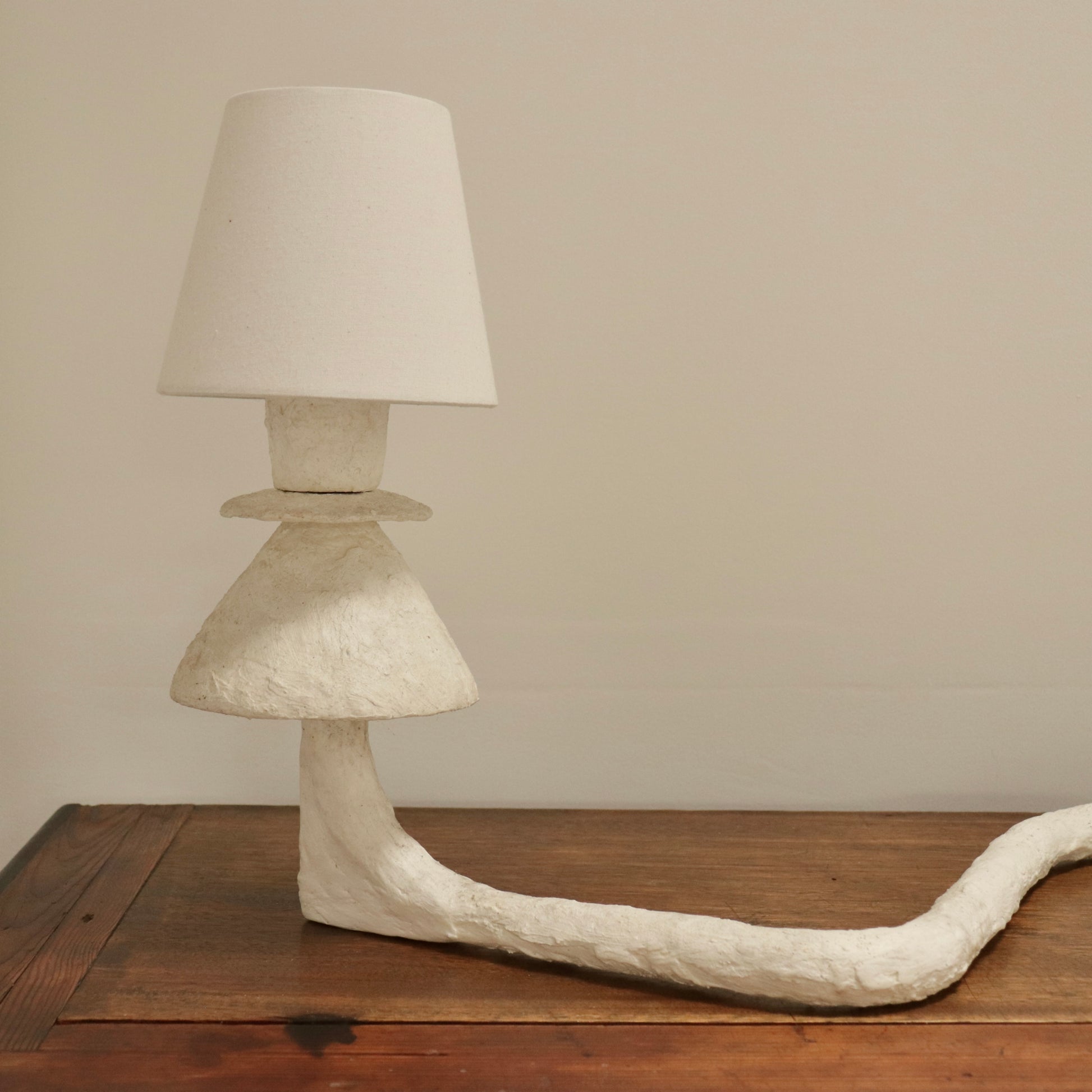 A one-of-a-kind sculptural lamp, hand-formed in plaster with an expressive, almost improvised presence. The design combines a tiered, totem-like base with a long, serpentine stem that stretches across the surface it rests on, giving the piece a playful sense of movement.