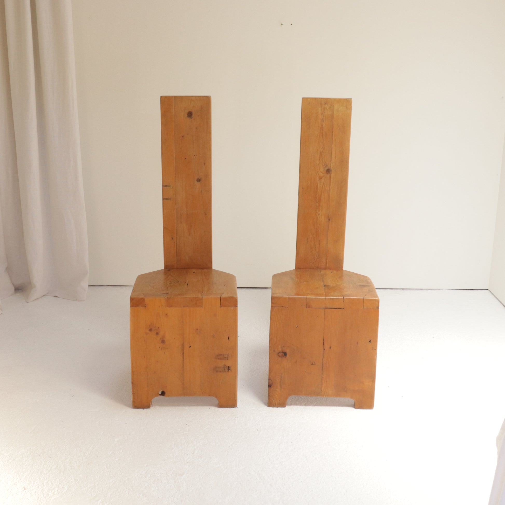 Chunky timber forms are joined with visible dovetail joints, the handwork proudly unvarnished. Each chair is unapologetically angular, with a tall slab backrest and weighty stance that feels part furniture, part architecture. The pine has aged beautifully, with warm honey tones and scattered knots, blemishes, and tool marks that serve as a record of honest labour.