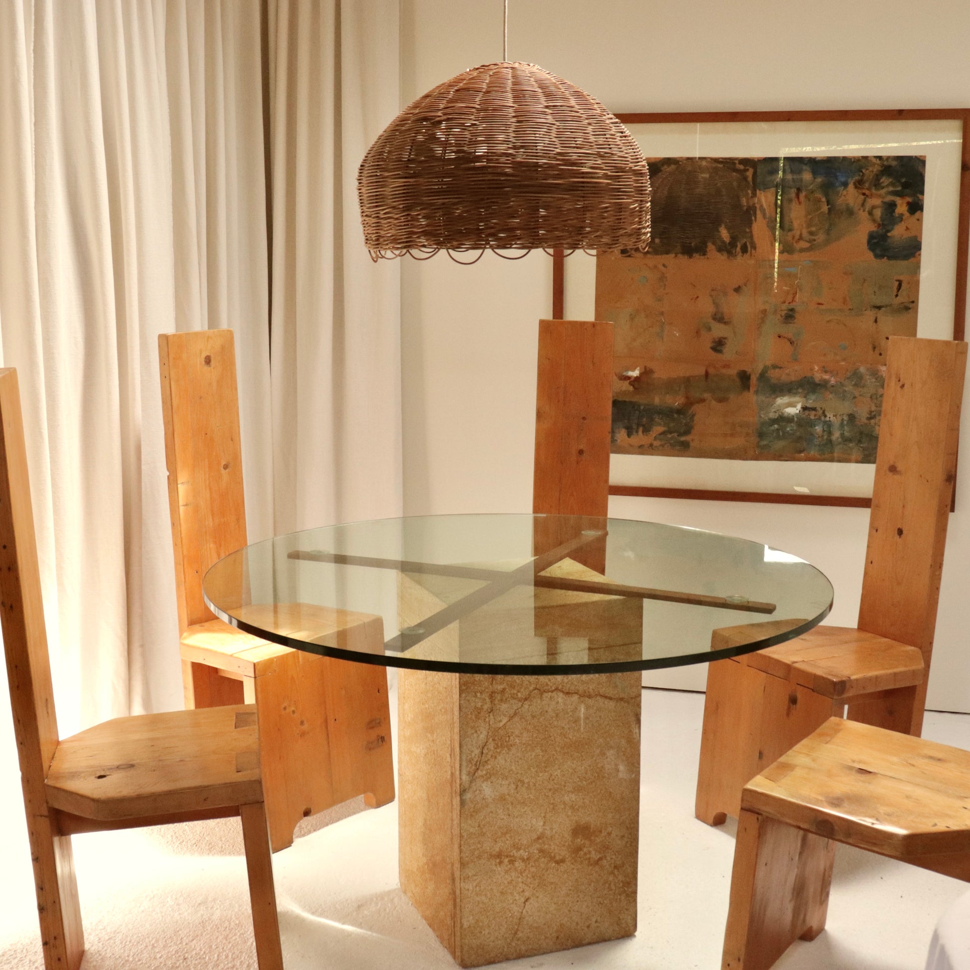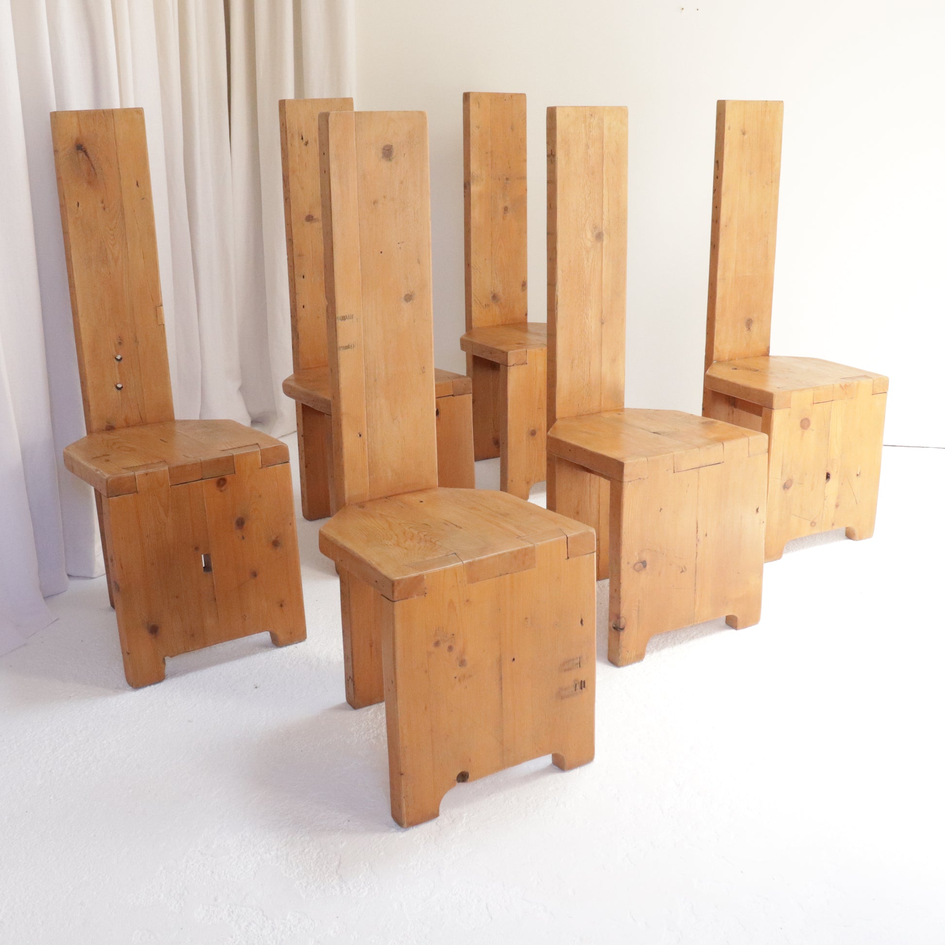 A striking ensemble of six sculptural dining chairs, crafted in solid pine with a raw, monastic presence. Likely 1970s in origin, these pieces channel the elemental language of Alpine modernism and self-build Brutalism—think Charlotte Perriand meets a mountain carpenter.