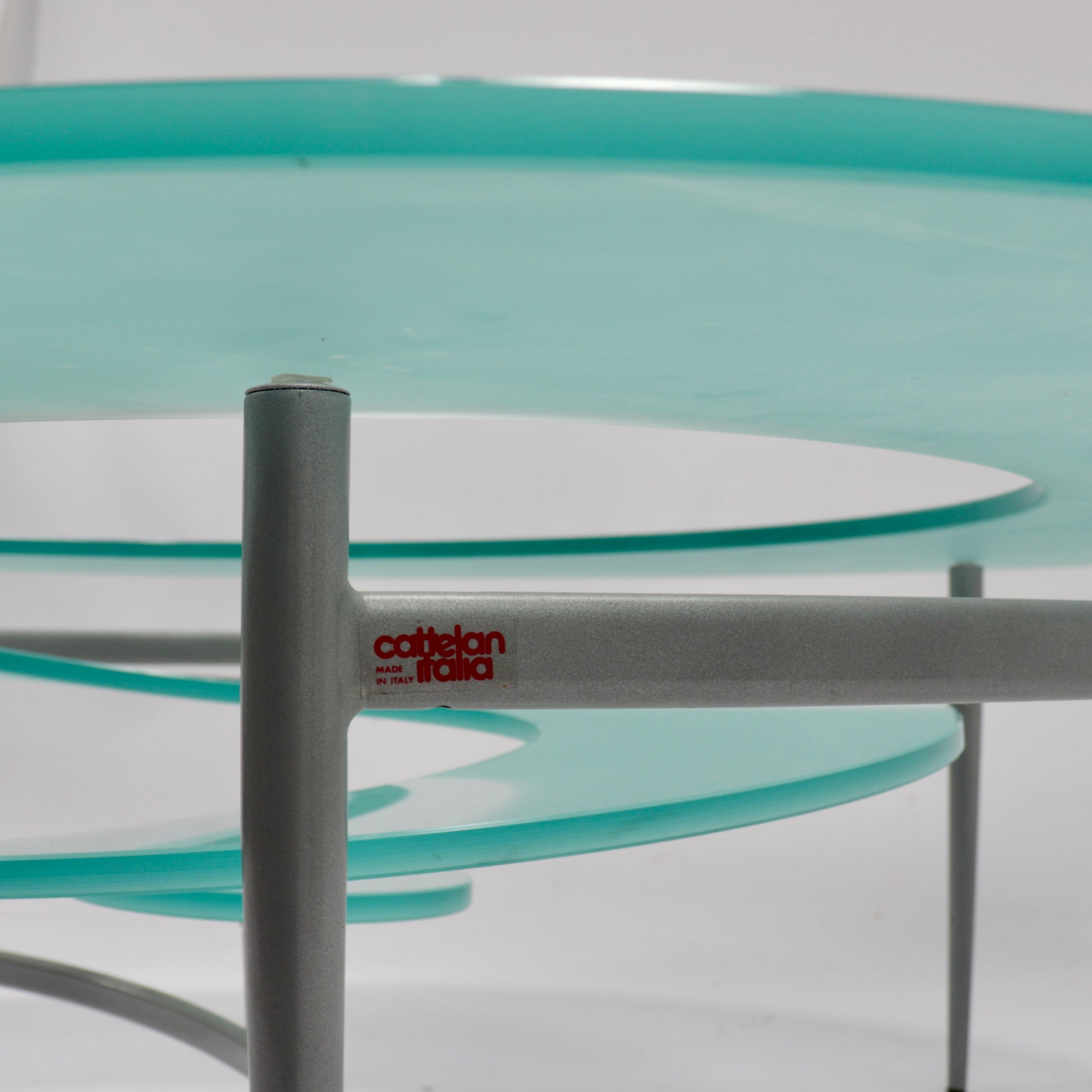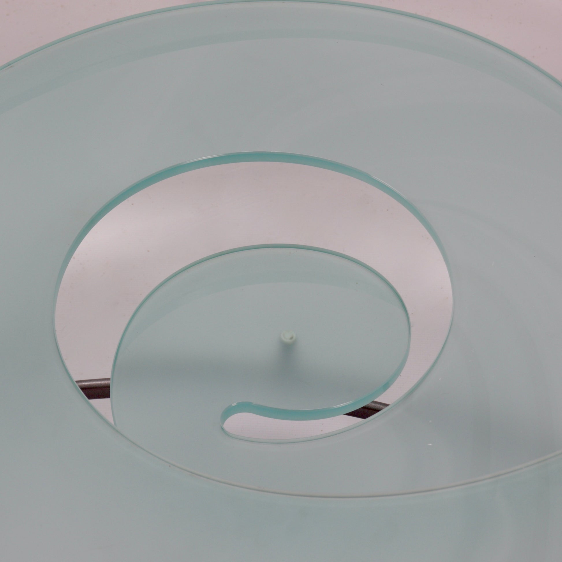 A sculptural and iconic coffee table by Cattelan Italia, featuring a distinctive spiral form evocative of a nautilus shell. Composed of layered frosted glass sections mounted on minimalist steel legs, the design offers an elegant interplay of light, shadow, and negative space. A statement piece of Italian postmodernism from the late 20th century.