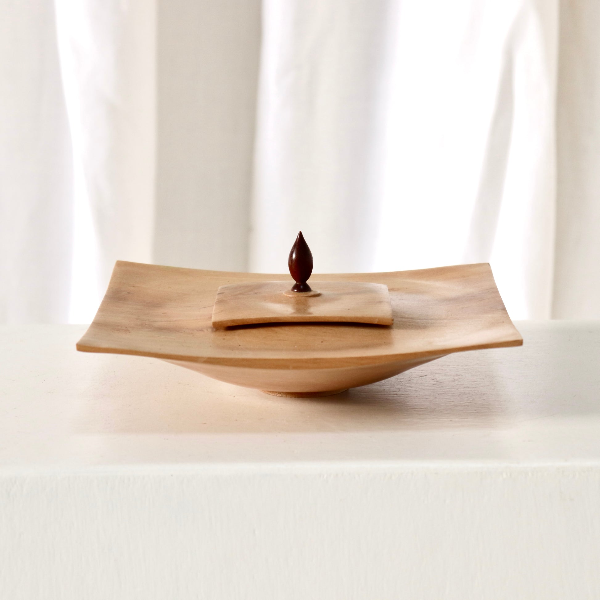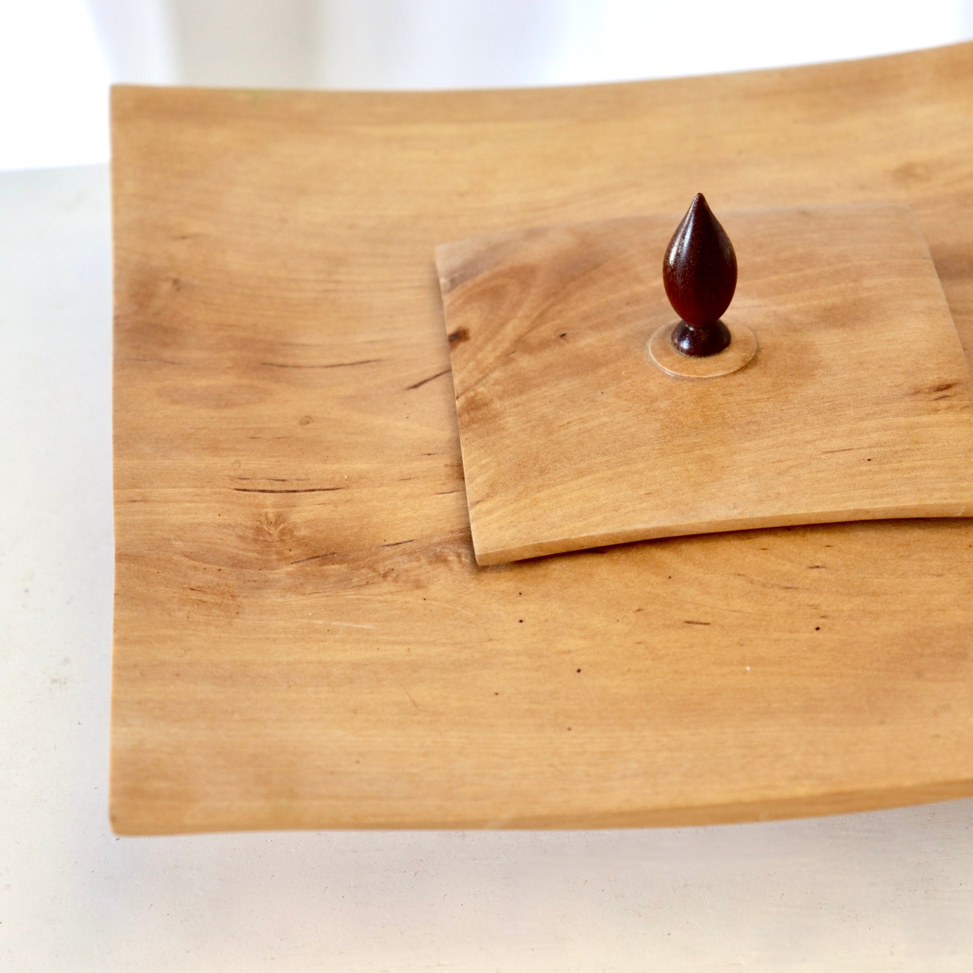 At its centre rests a square lid, crowned with a dark, teardrop finial—a quiet flourish that offsets the restraint of the form. Beneath, a hidden recess offers a secretive space for keepsakes or jewellery, marrying elegance with function.