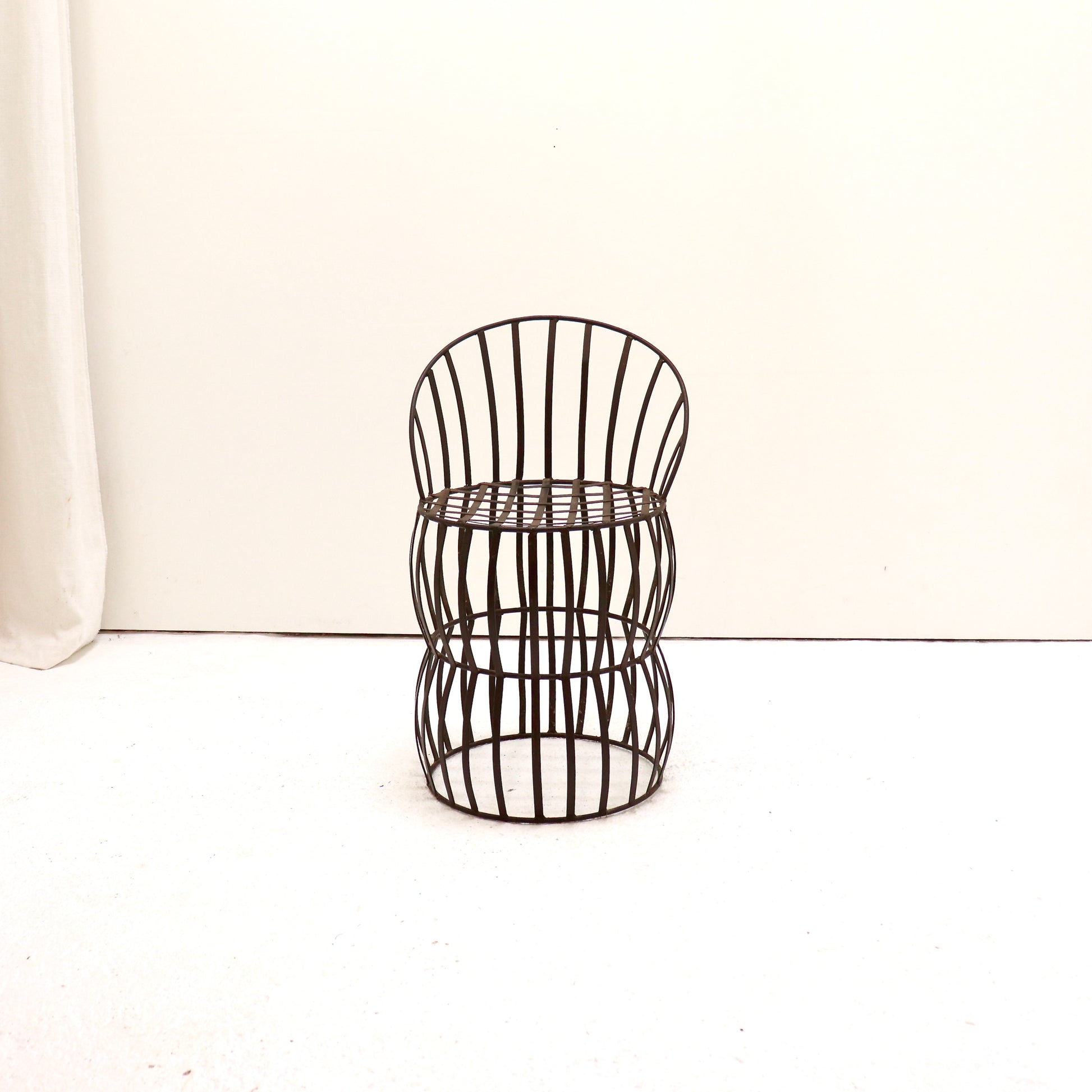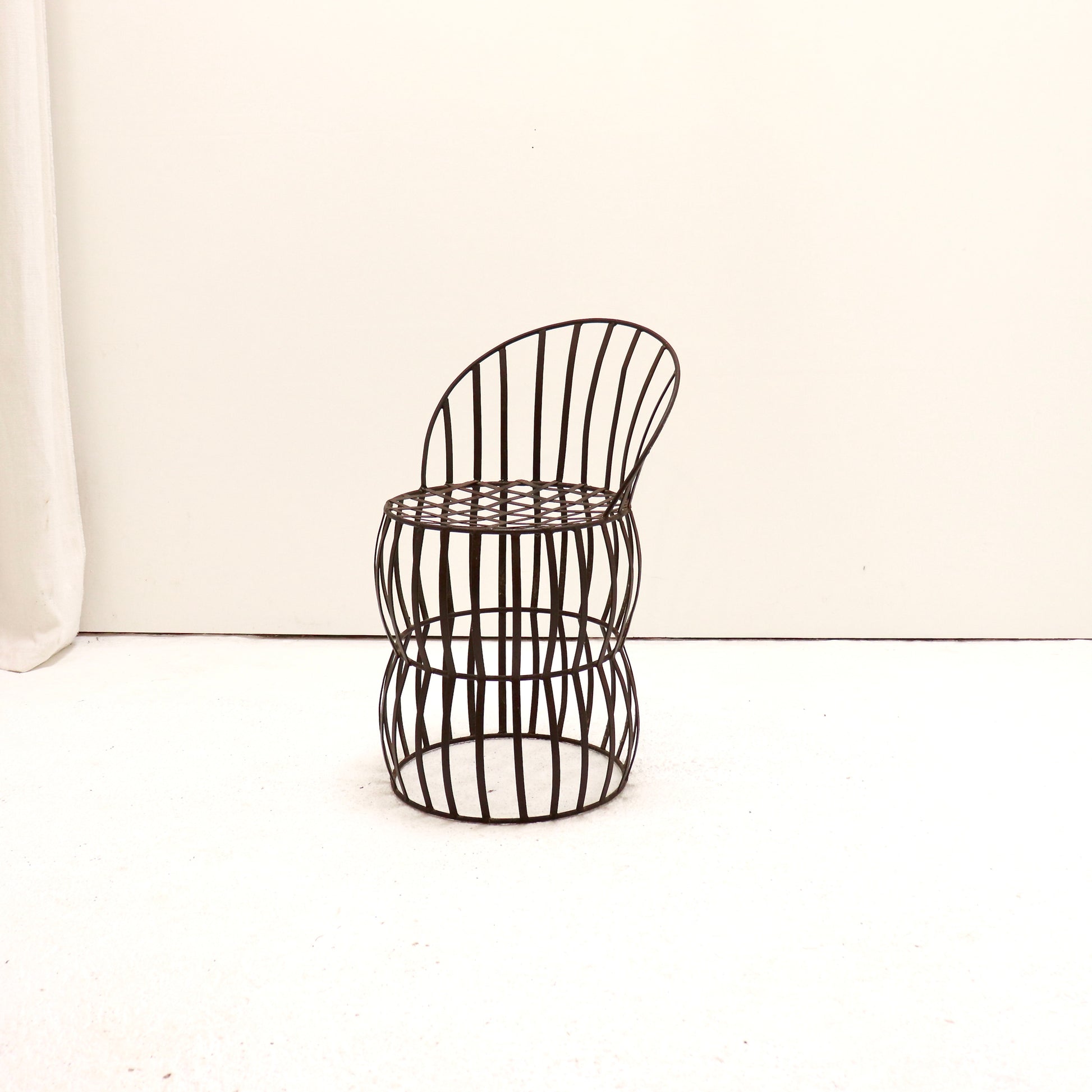 A lyrical piece of French metalwork, forged from narrow iron straps into a double-drum, cage-like silhouette. The gently raked back and oval seat are latticed and welded, giving the chair a light, architectural presence—somewhere between vineyard cooperage and atelier sculpture. The dark, time–softened patina brings warmth and depth; edges show the faint hammer marks and brazed joints you only get with workshop work of the period.