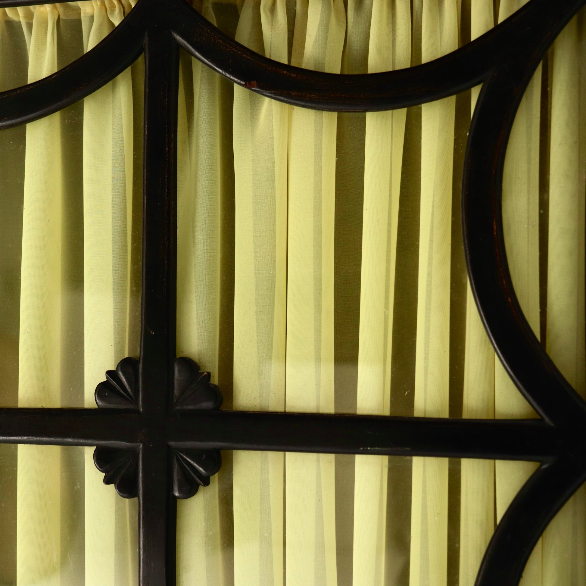 Behind each panel, soft lemon-toned gathered fabric lining adds a theatrical softness, contrasting the clean lines of the frame. The whole is elevated on square tapered legs with ebonised finish, giving the piece an elegant stance and modern profile.
