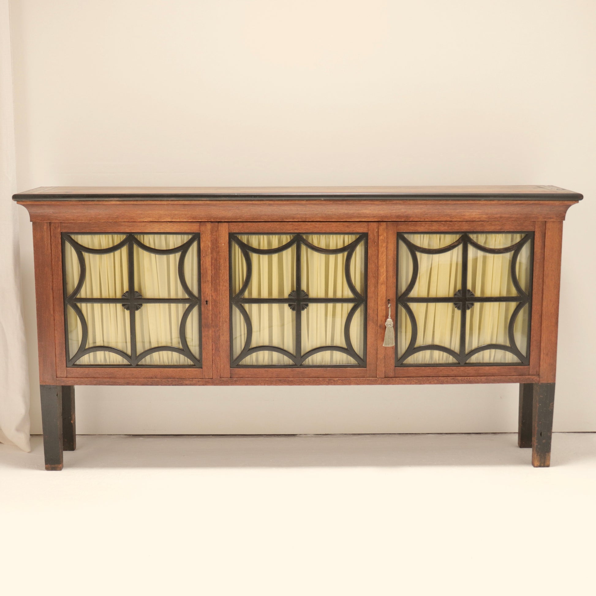 A refined and distinctive piece, this early 20th century French sideboard brings together classical form with striking visual detailing. Crafted from rich oak with a gently bow-fronted silhouette, its three glazed doors are inset with original glass and overlaid in decorative blackened wood tracery—creating a bold geometric pattern that nods to Gothic Revival and Art Nouveau influences.
