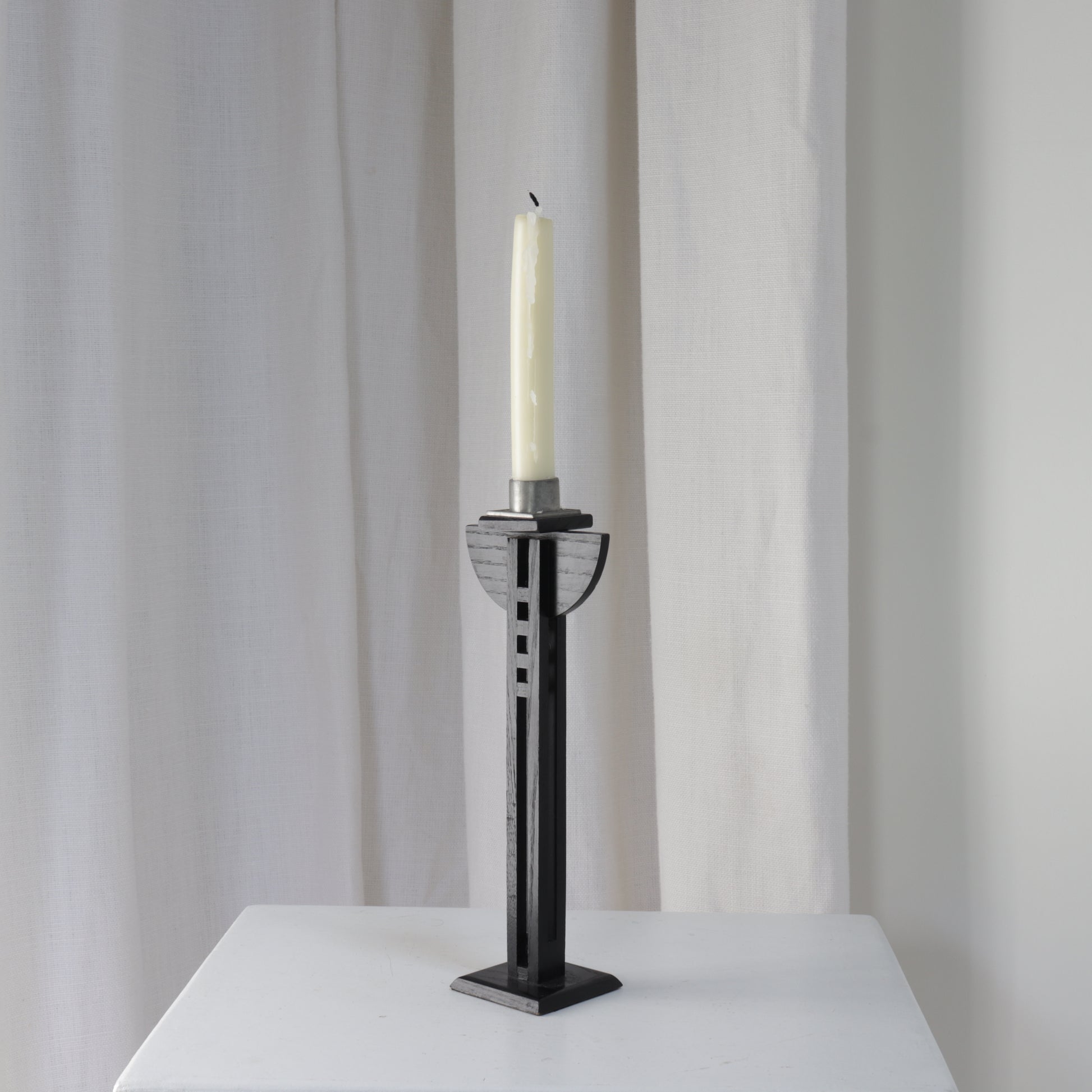 A metal candle cup crowns the form, offering a subtle material contrast and nodding to the Arts and Crafts ethos of honest construction. The ebonised finish enhances the crisp lines and plays beautifully with shadow, making it as much a piece of sculpture as a functional object.