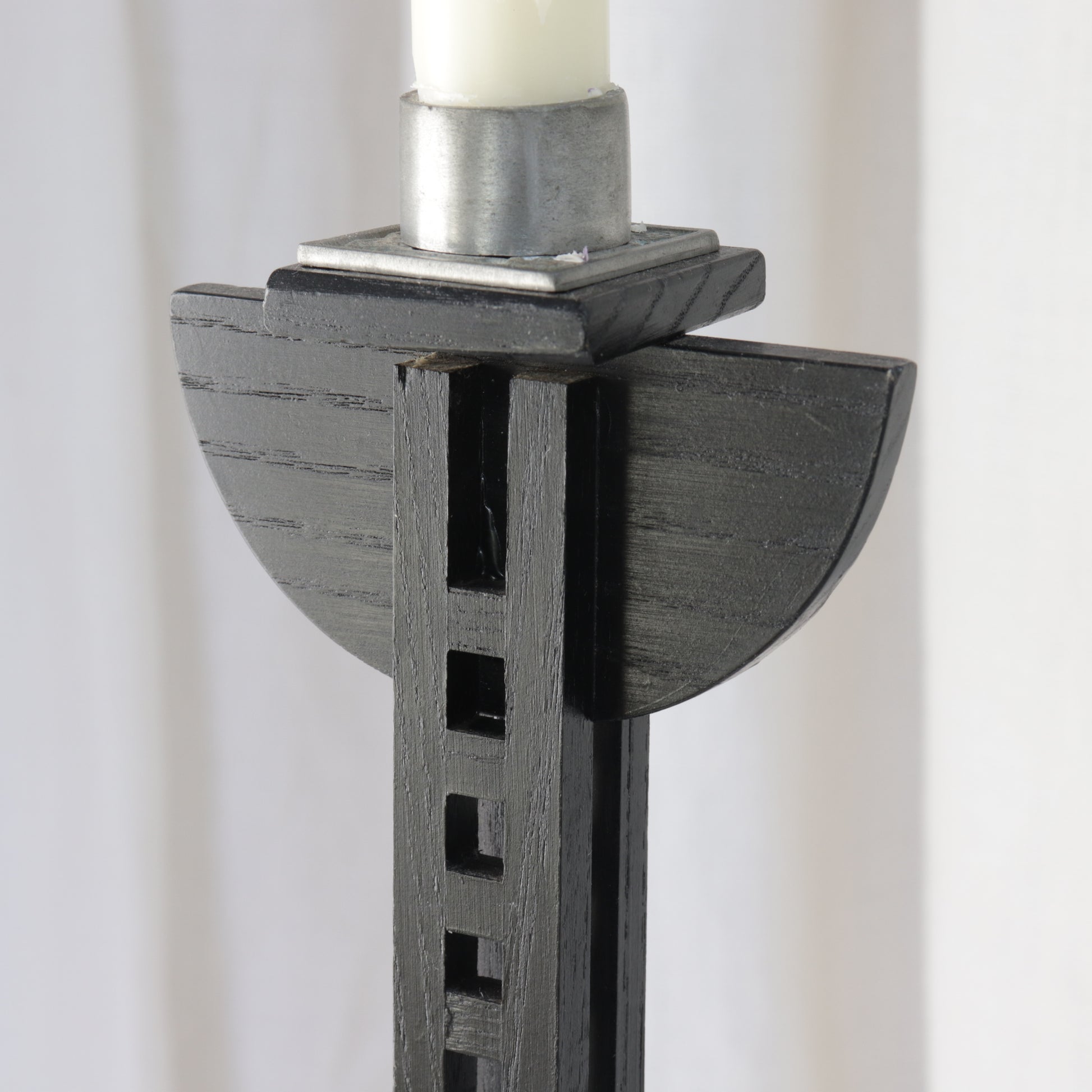 With its clean geometry and architectural presence, this ebonised oak candlestick channels the distinctive design language of Charles Rennie Mackintosh. The tall, square-section stem is pierced with a rhythmic vertical run of small cut-outs, giving the piece a sense of lightness and proportion, while the semi-circular side panels add a bold, graphic counterpoint.
