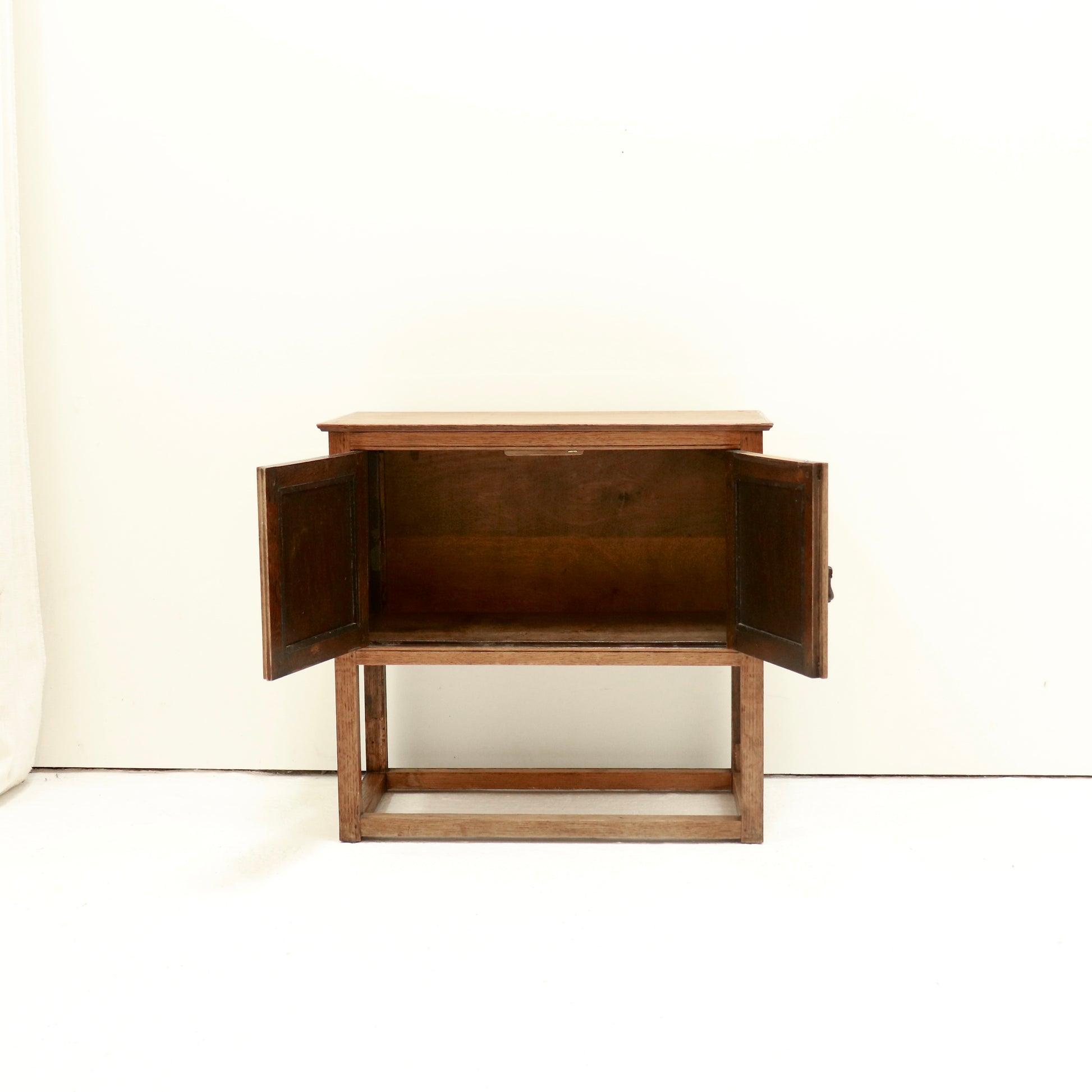 A compact oak cupboard with bold, stepped door panels that nod to Brutalist geometry in a friendly, useful size. The two panelled doors are framed by crisp, applied mouldings and finished with a small drop handle; the carcass sits on an open stretchered plinth that keeps the profile light. Inside is a single, full-width compartment—ideal for glassware, books or the not-so-pretty tech. Warm, lively grain throughout and a mellow, lived-in finish that gives it character without shouting.