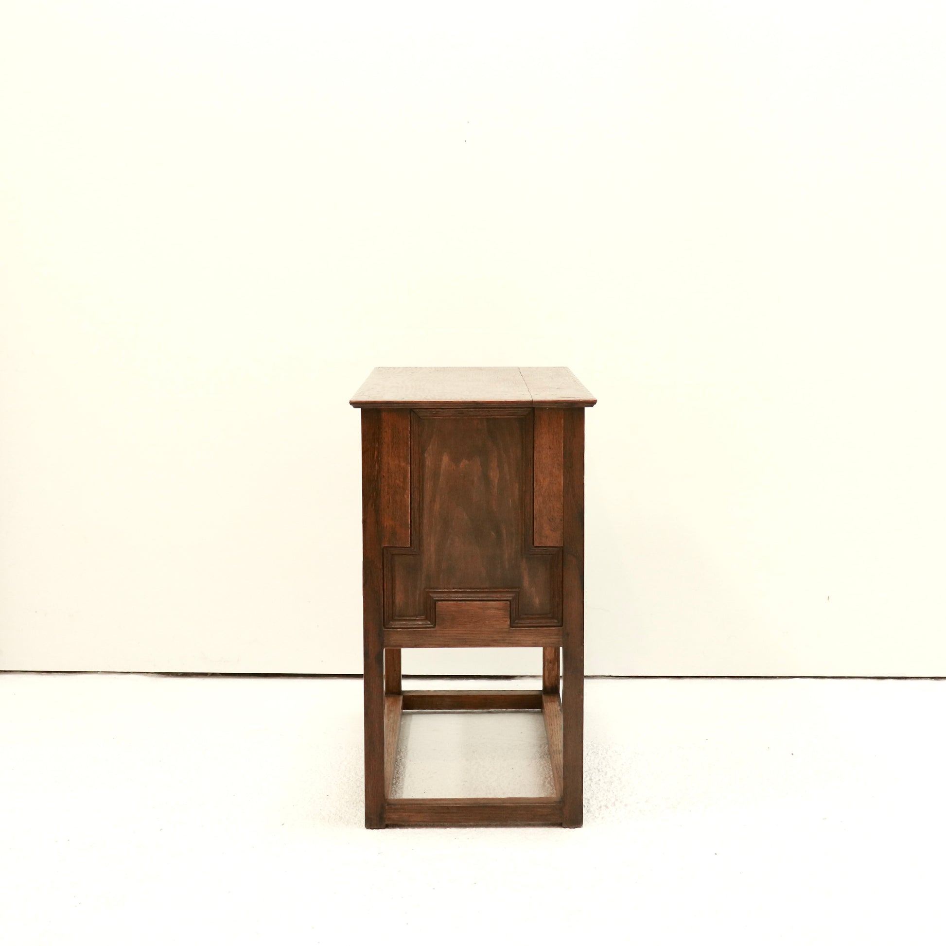 Material: Solid oak with applied geometric mouldings; metal drop handle