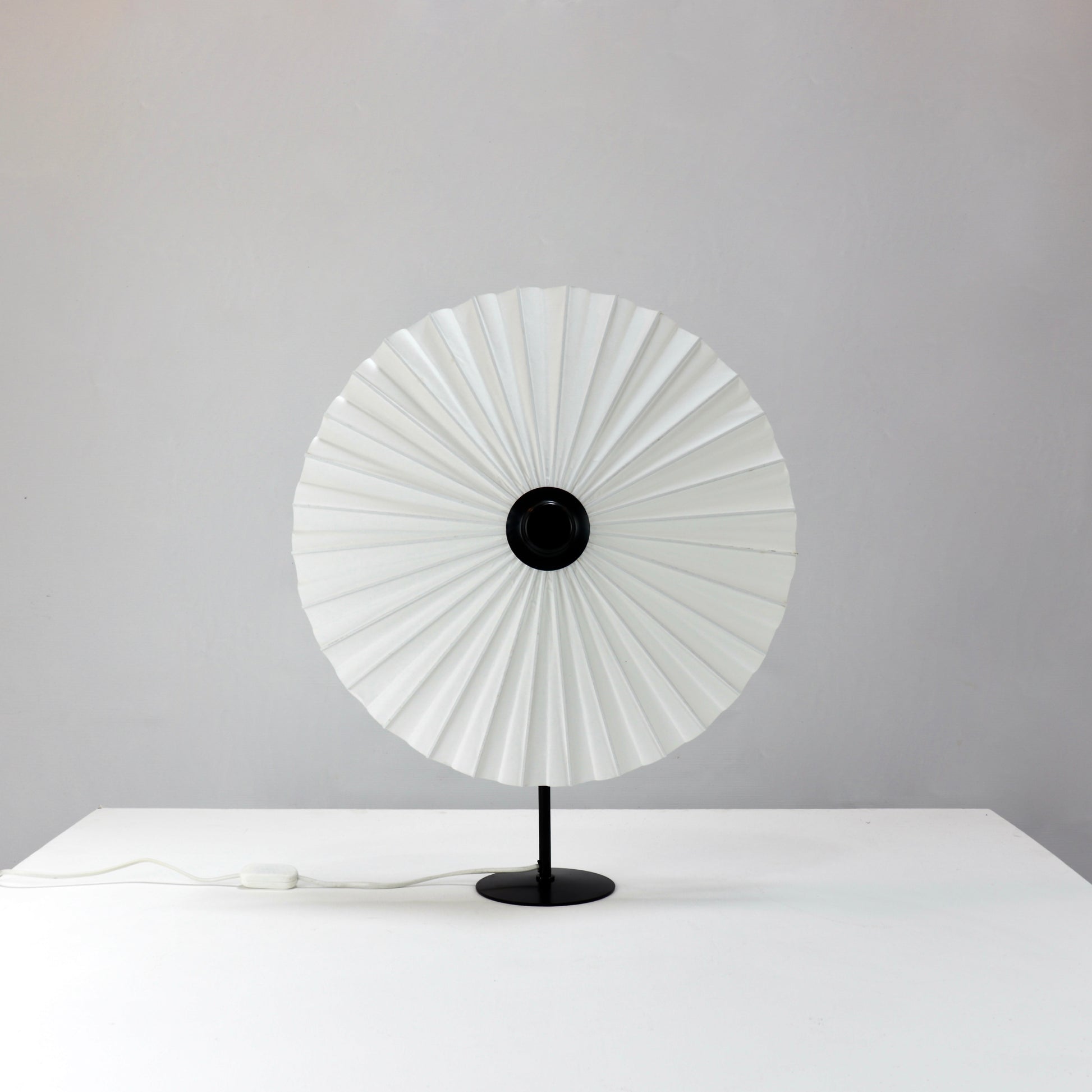 A refined powder coated metal stem and paper parasol type shade makes it a strikingly sculptural lamp with a pure and minimal form.