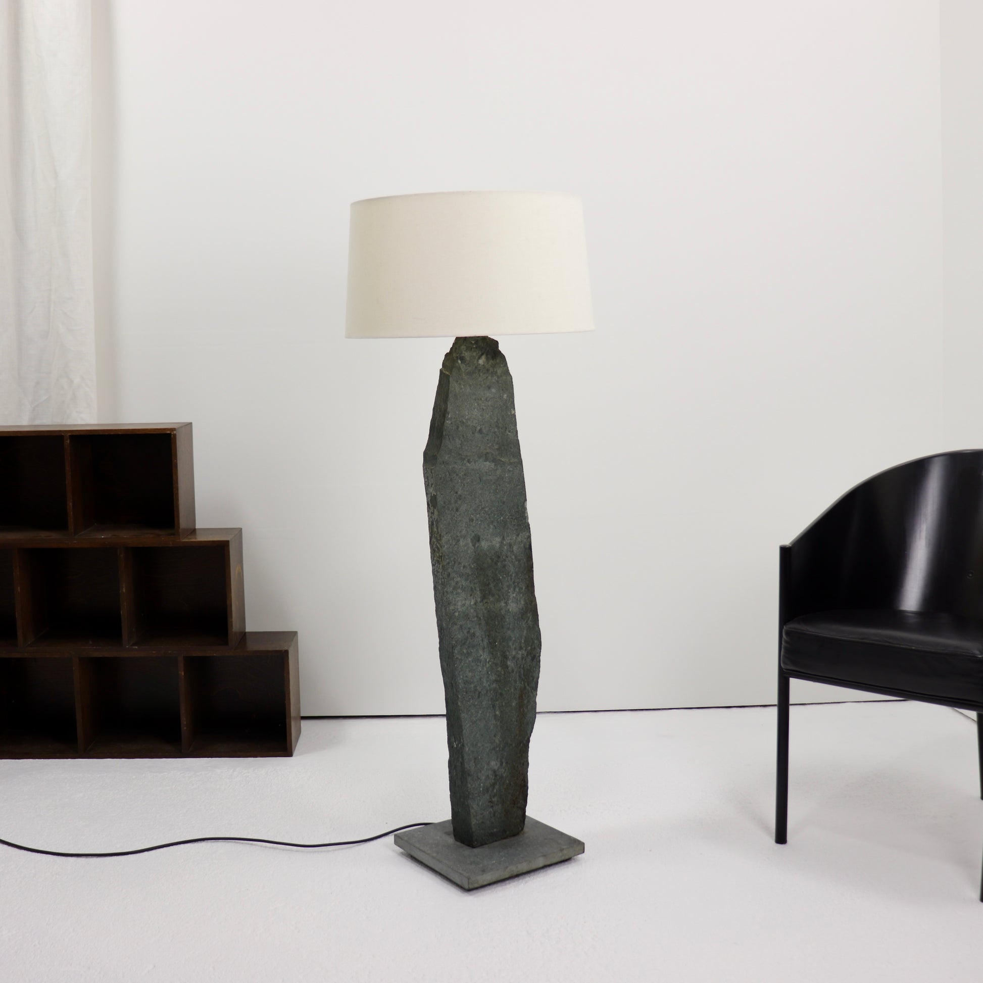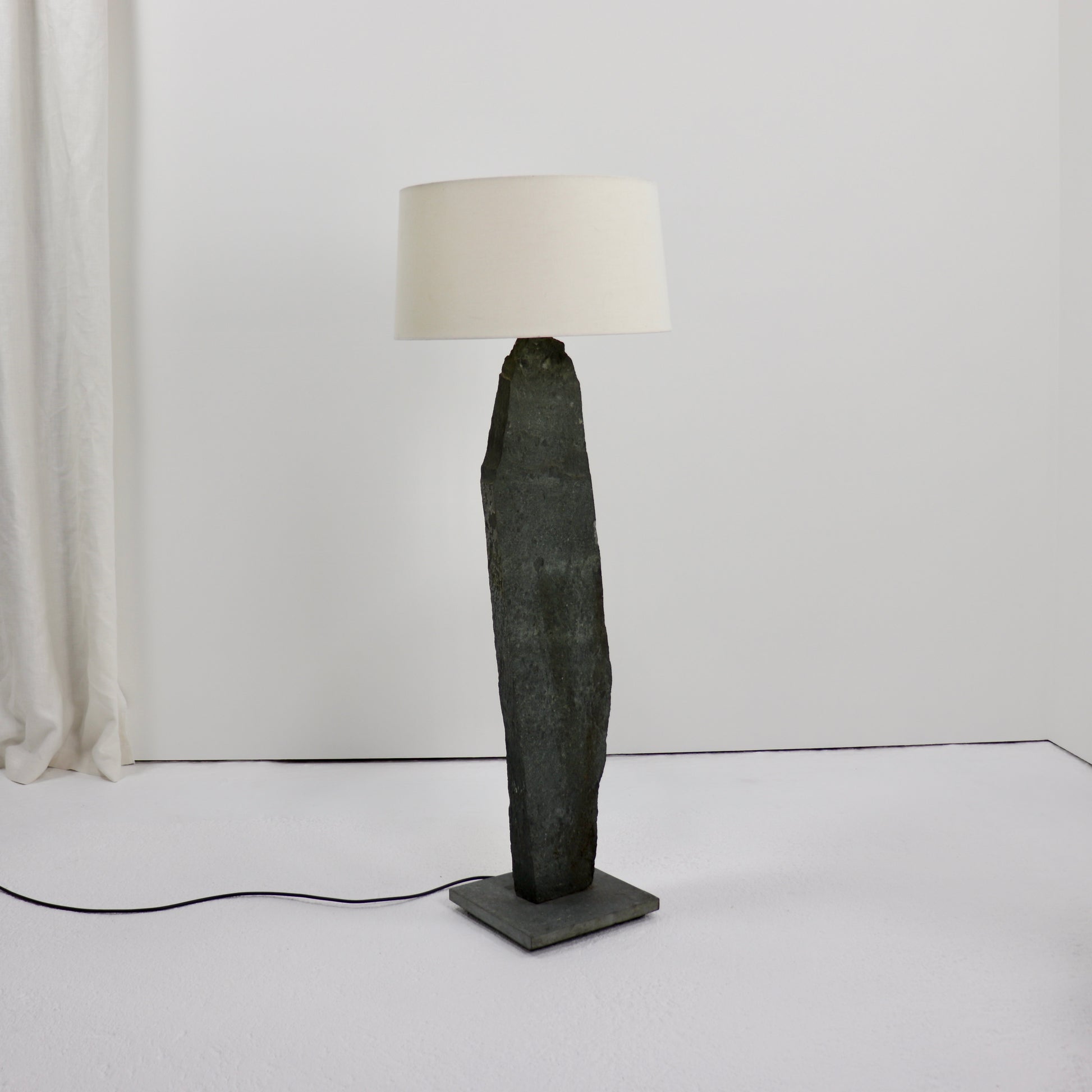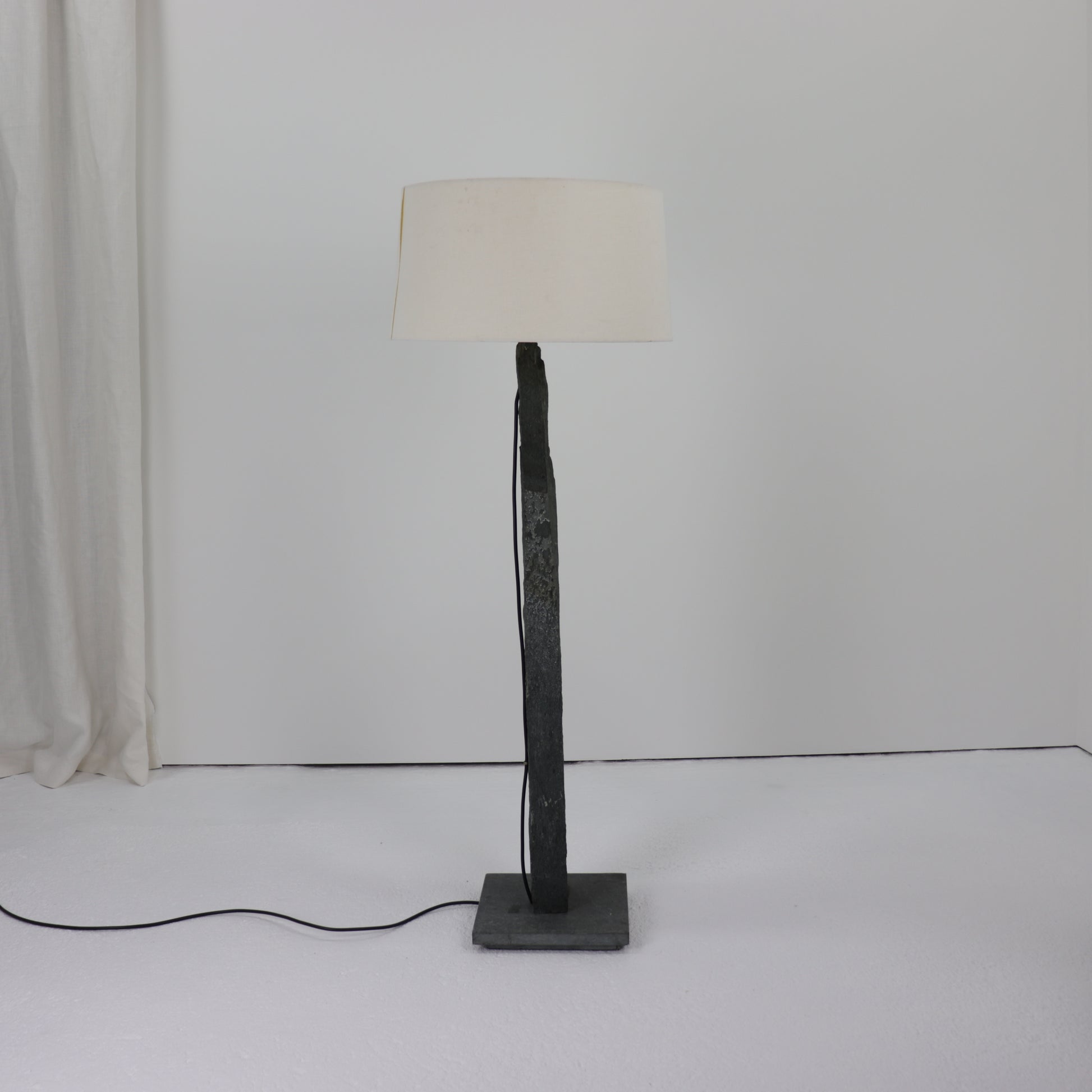 This commanding floor lamp is hewn from a single slab of slate, as if pulled from a forgotten field of standing stones. Its raw, sculptural form brings a primal, elemental presence to any interior, evoking both ancient landscapes and mid-century modern minimalism.
