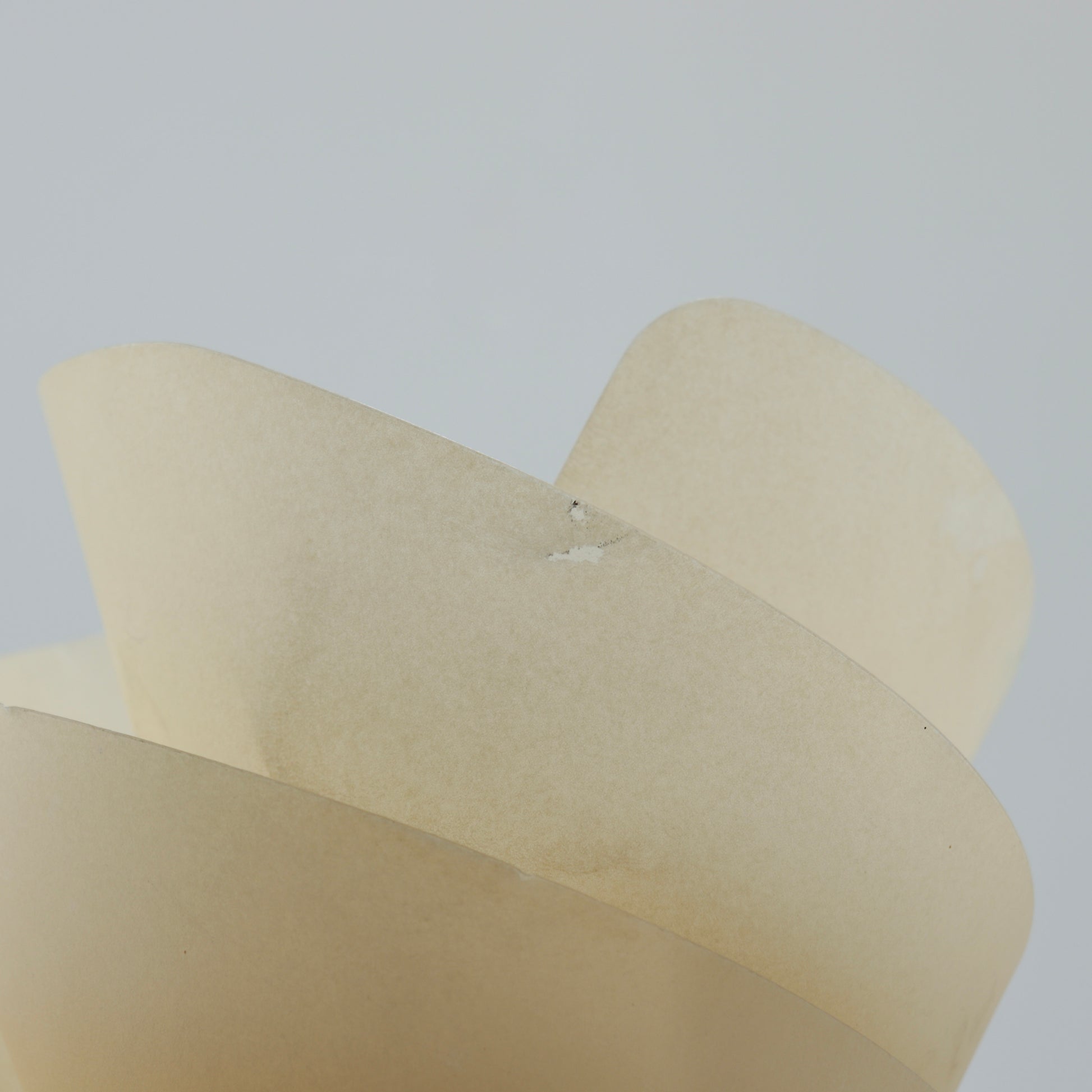 This sculptural table lamp swirls upwards in a continuous spiral of parchment-like planes—an elegant study in rhythm, shadow, and form. Likely 1980s or ’90s in origin, it captures the spirit of postmodern experimentation with organic geometry and theatrical silhouette.