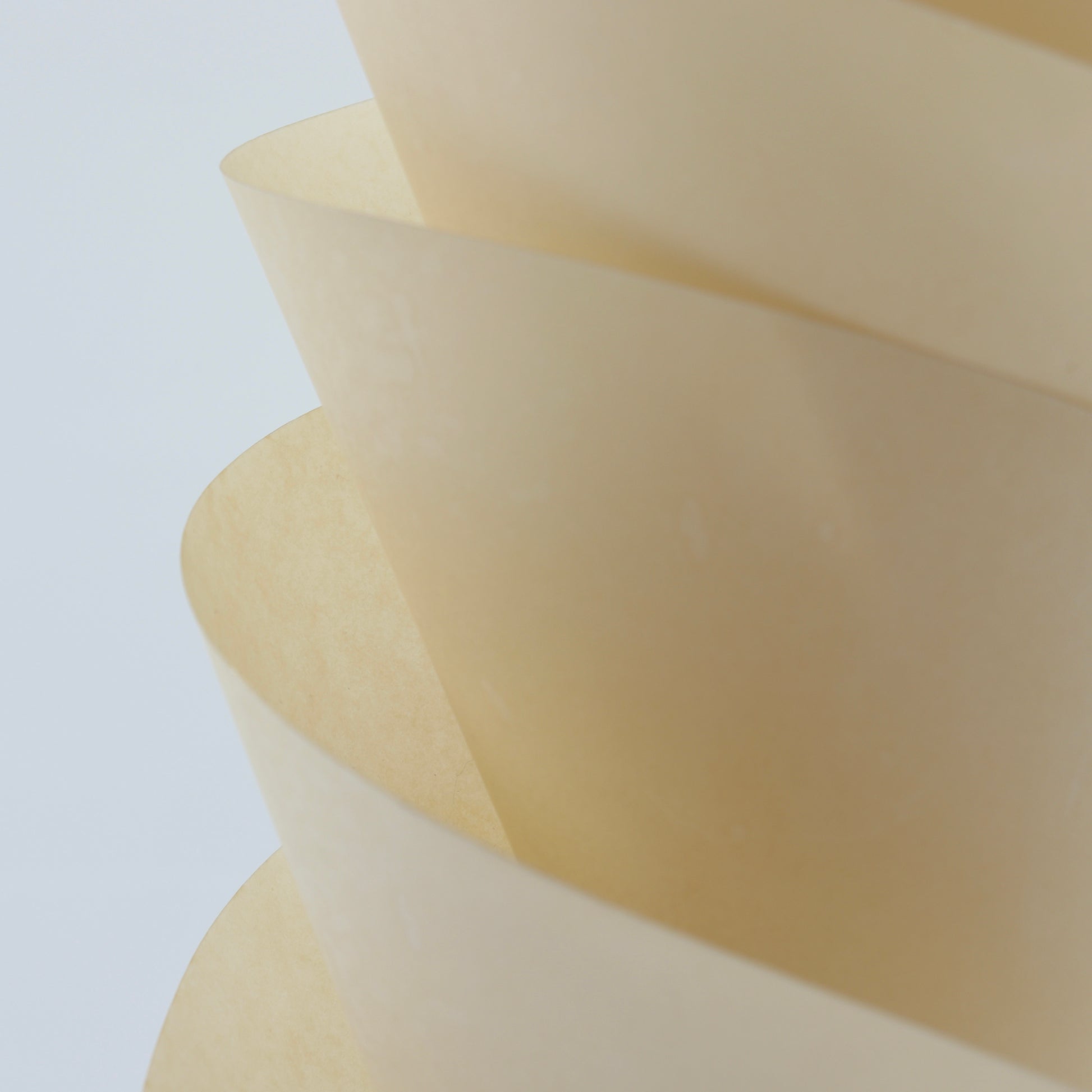 The translucent material diffuses a warm, golden glow, accentuating its undulating curves. Resting on a turned wooden cone base, it’s as much an illuminated object as it is a standalone sculpture.