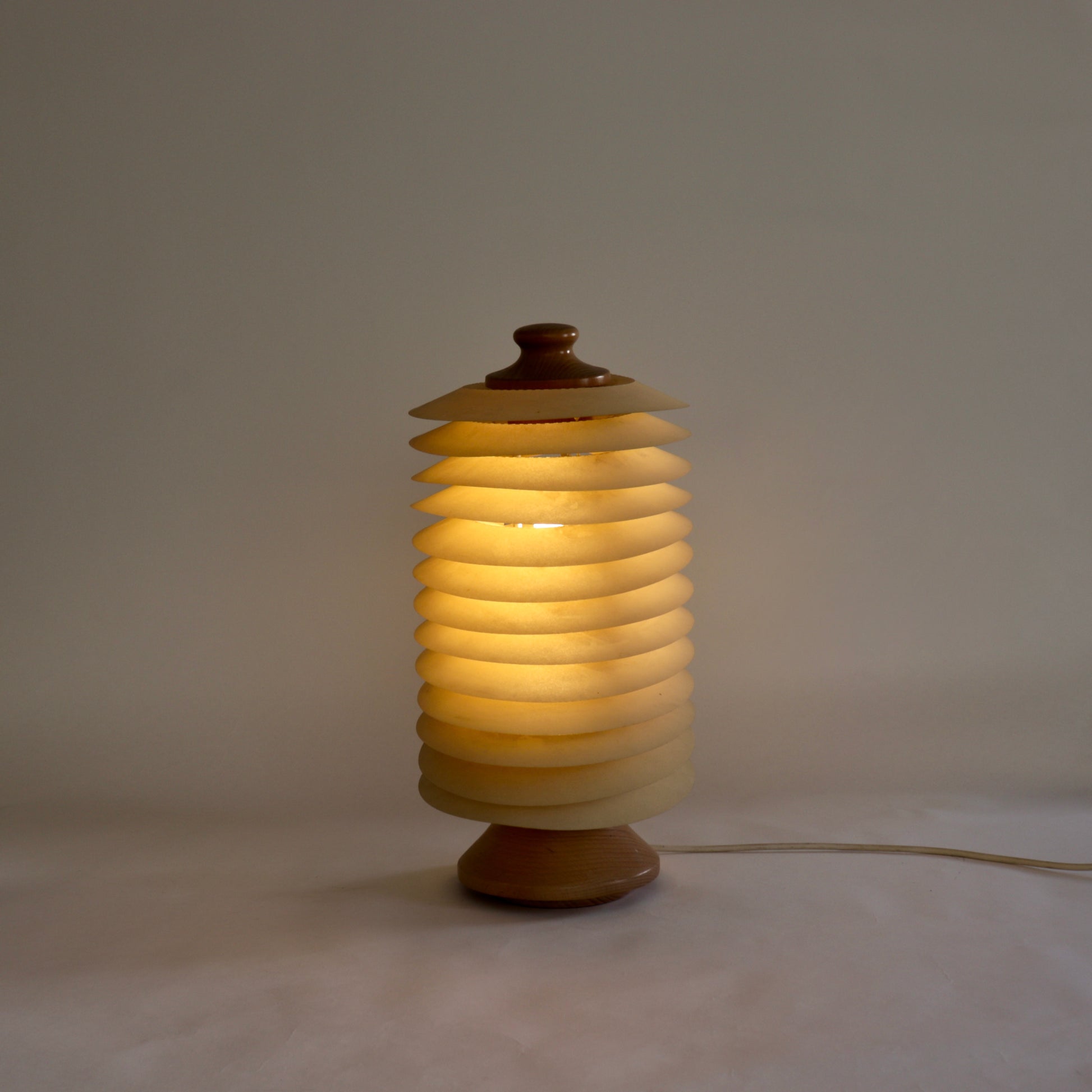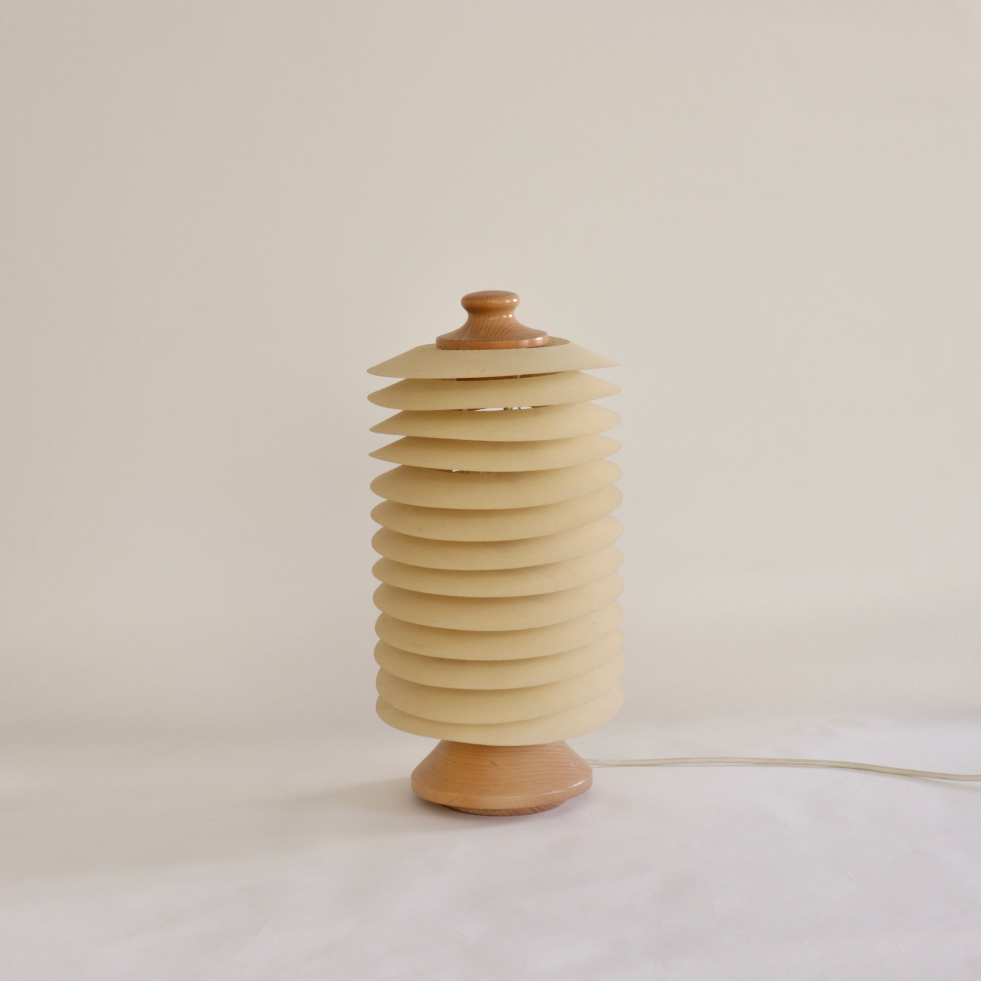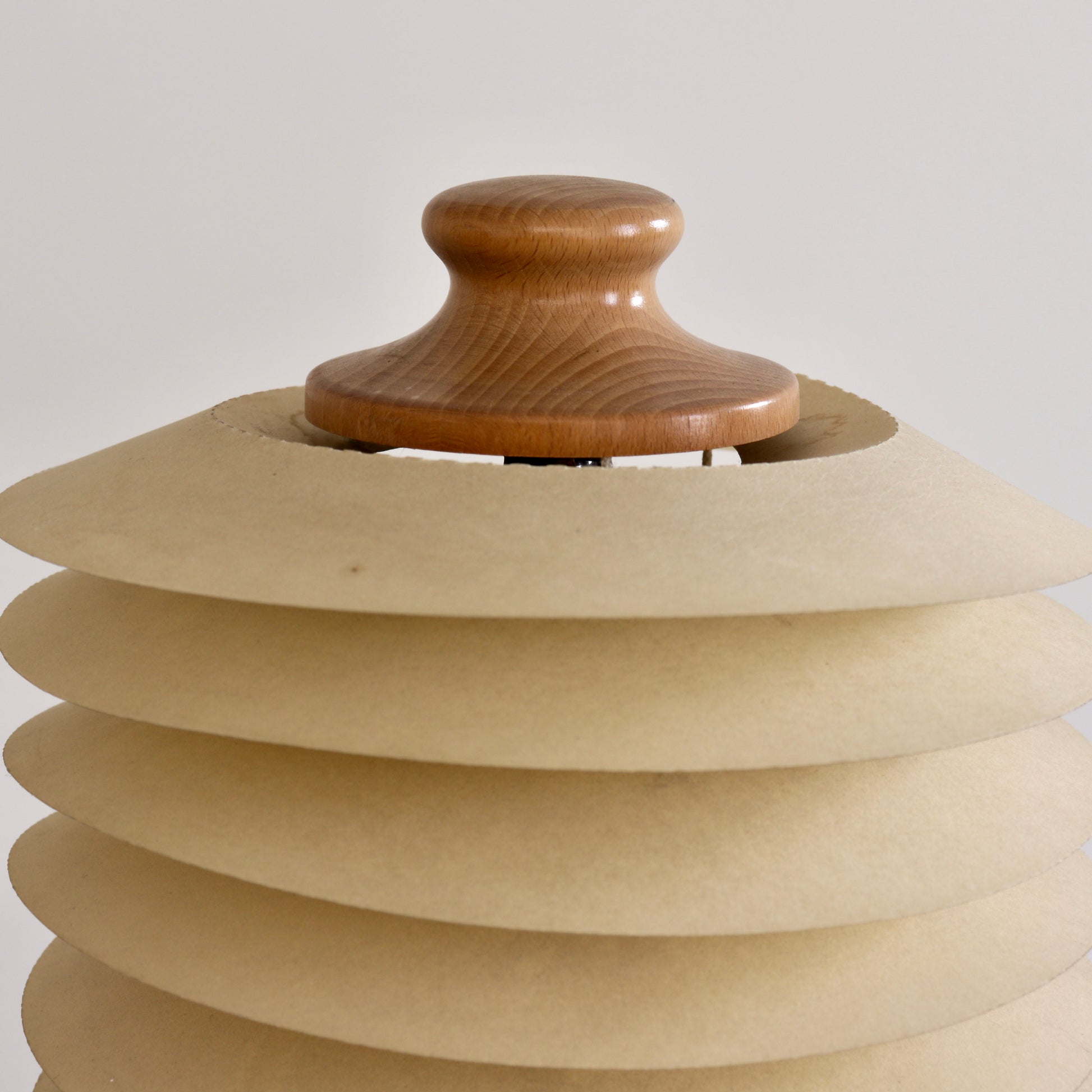 The layered rings of parchment provide a warm and diffused ambient illumination. They can also be handily tilted and positioned. Top and tailed with polished beech wood elements.