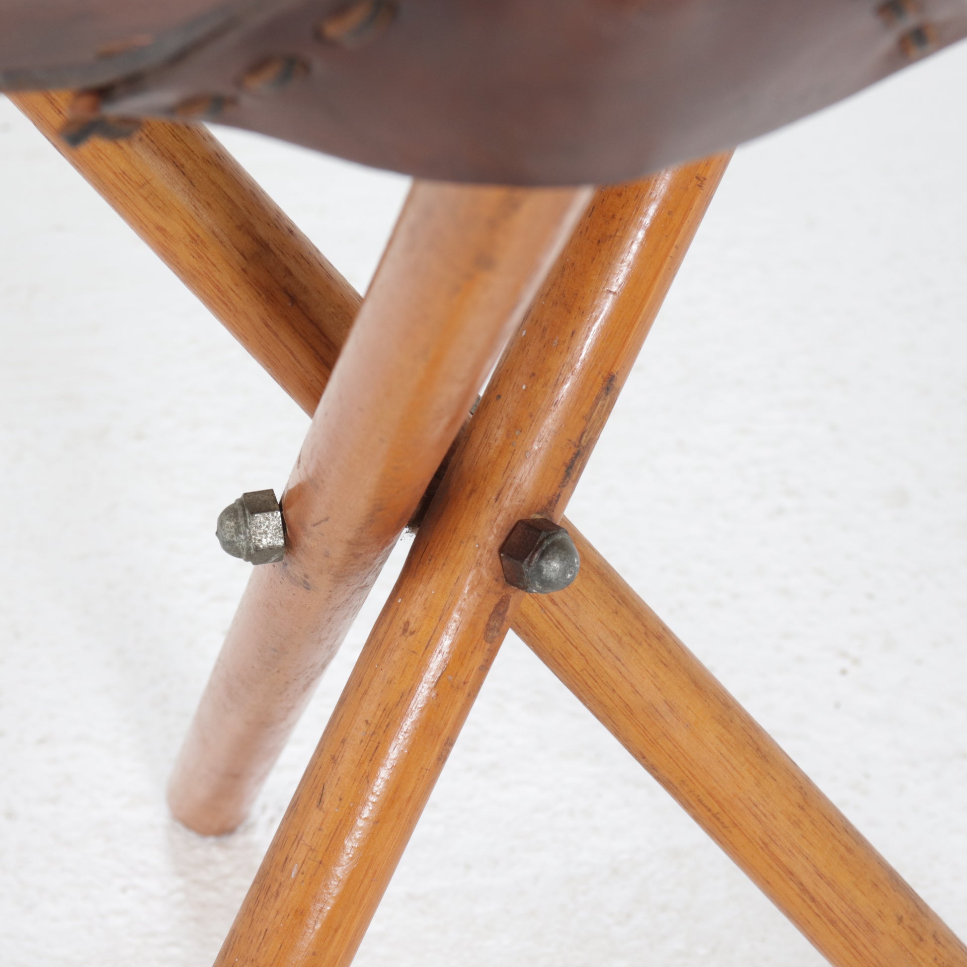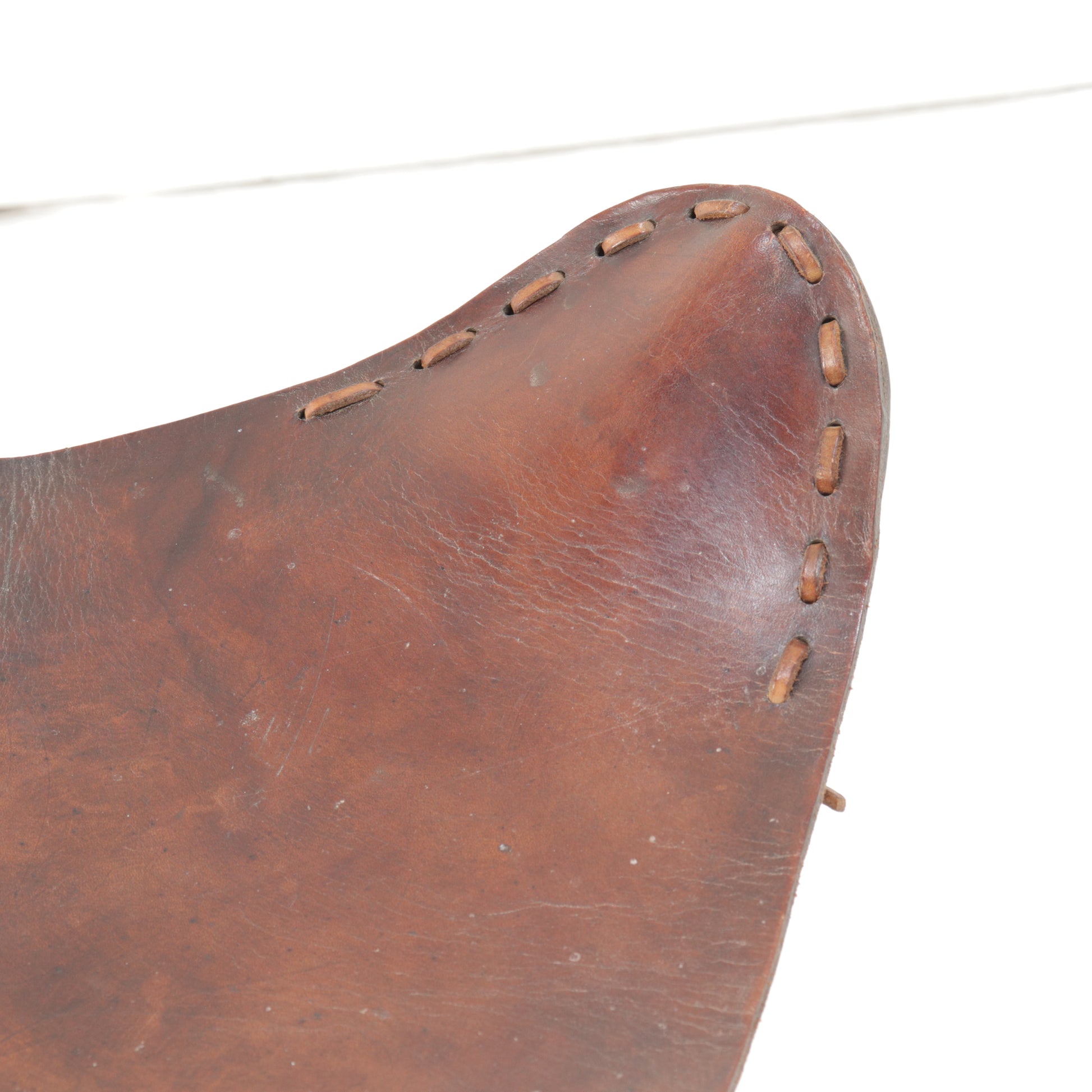 A handsome folding campaign stool with a sculptural presence, featuring a saddle-stitched seat in thick, well-aged leather and a tripod base of turned hardwood legs. The curved seat, richly patinated over time, offers both ergonomic comfort and visual appeal. Riveted details and metal hardware underscore its utilitarian roots, while the leather’s dark tone and deep sheen lend an elevated, almost equestrian character.