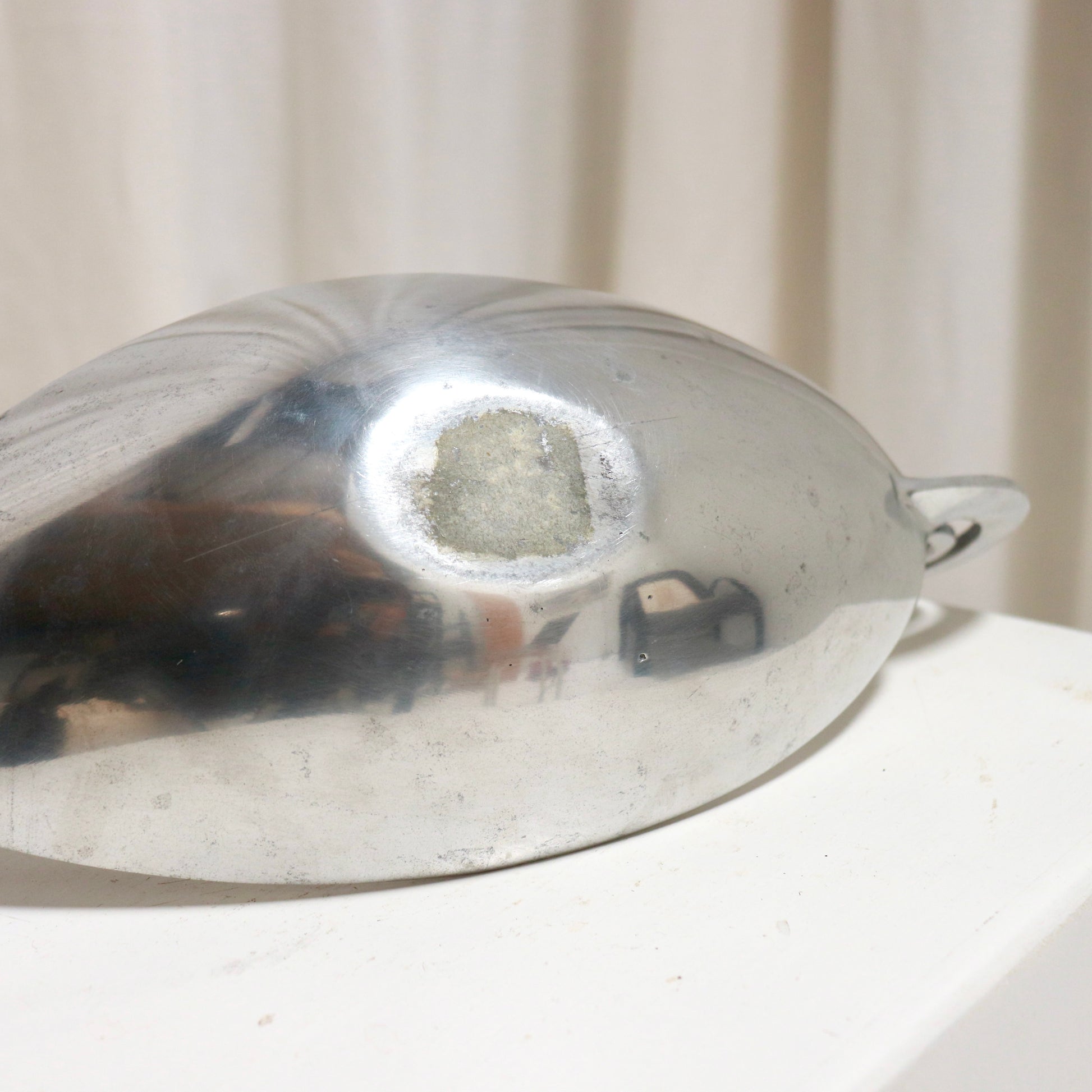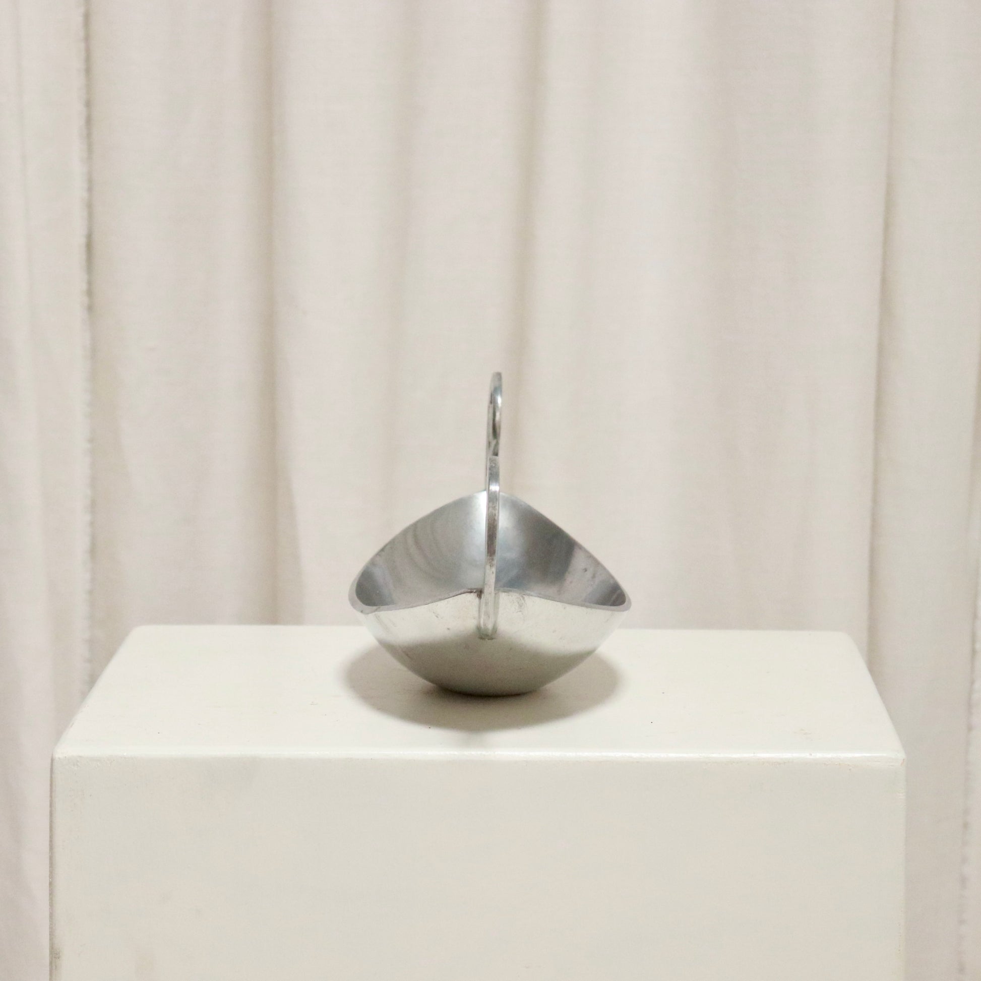 A vintage cast aluminium dish with upturned ends that terminate in tight scrolls. The shallow, boat-like bowl sits lightly on the surface; the handles curl into lyrical volutes so the whole thing reads like a miniature longship. Aluminium gives it a soft, silvery glow with honest workshop marks—equally good as a keys-and-coins catchall, a table centre for citrus, or left empty as a sculptural object.