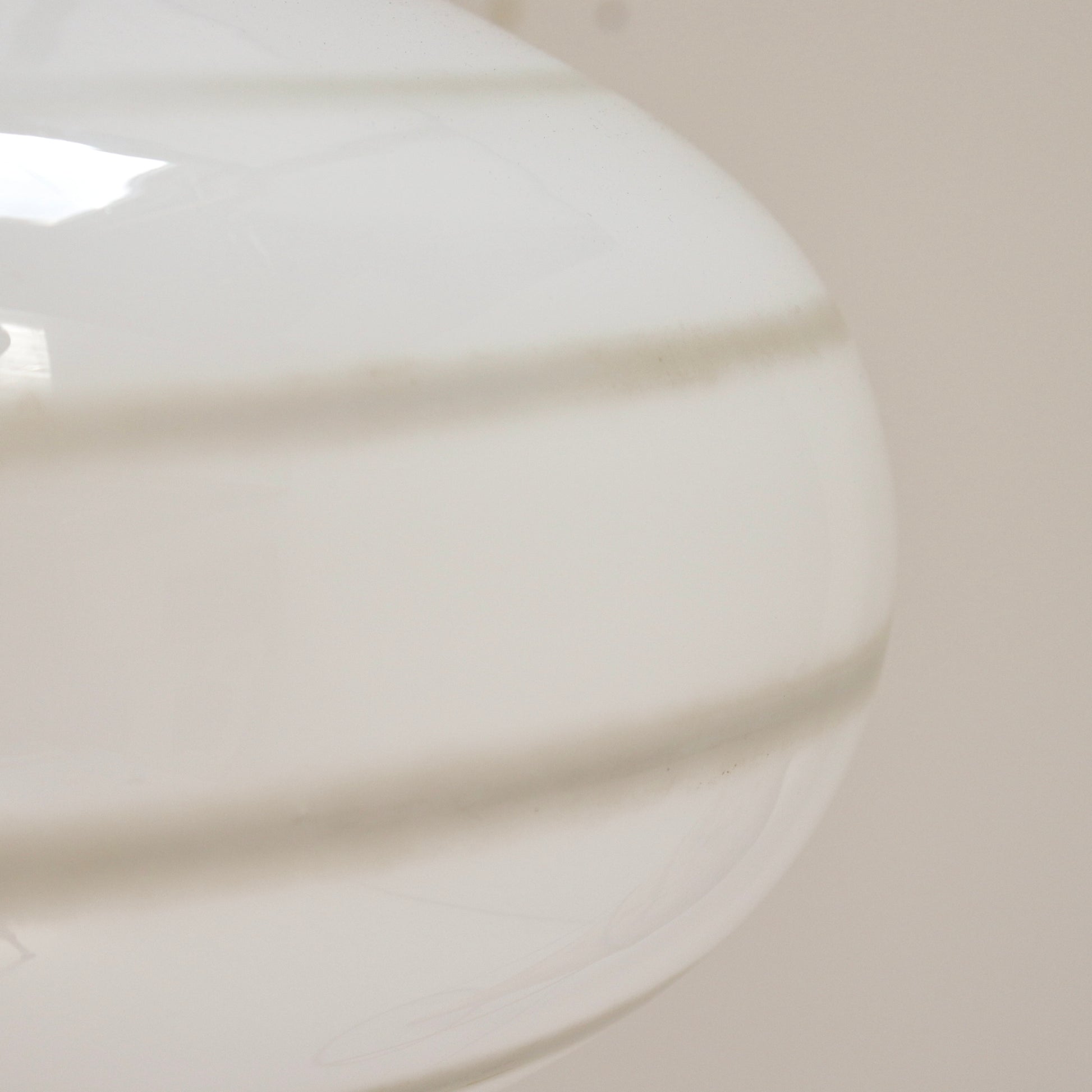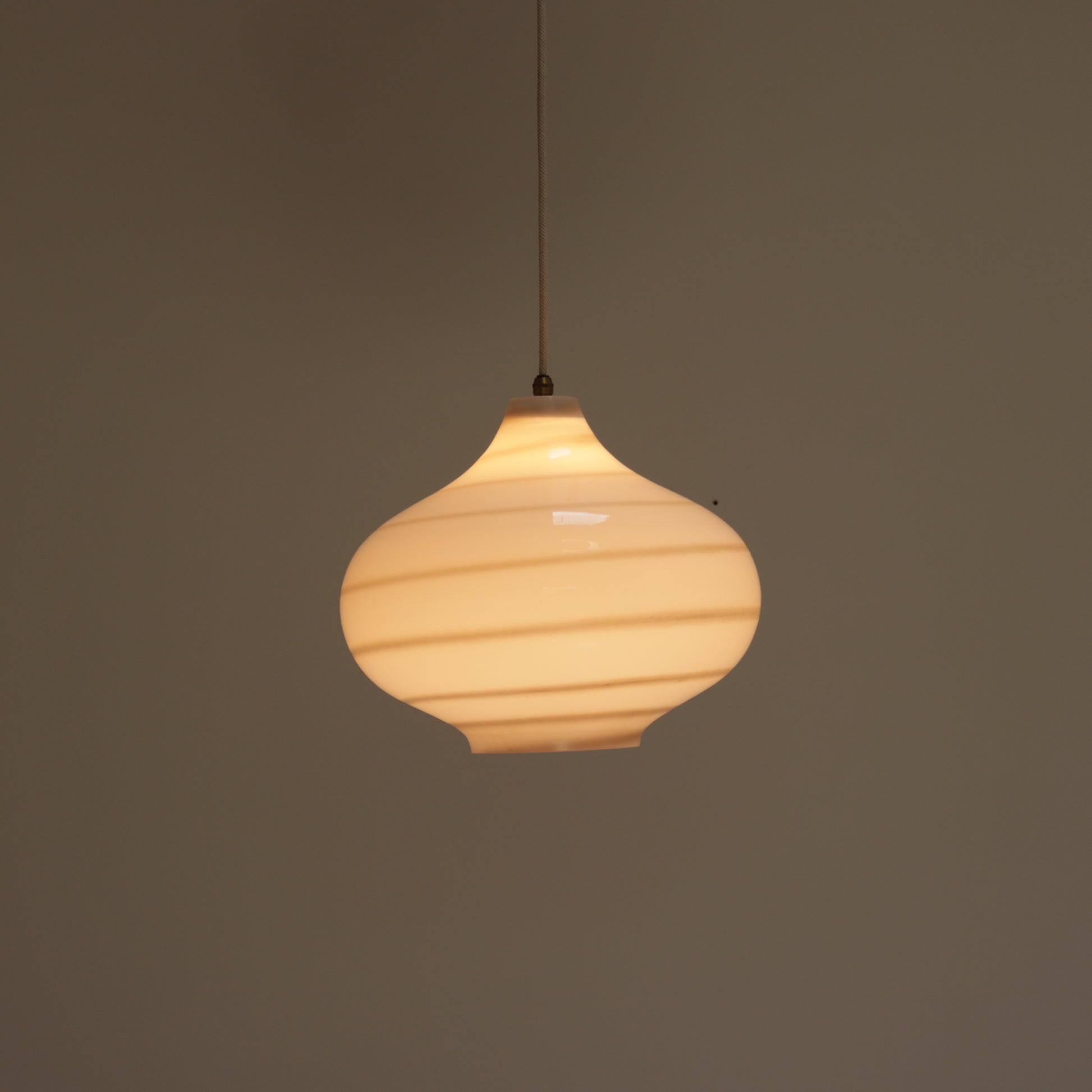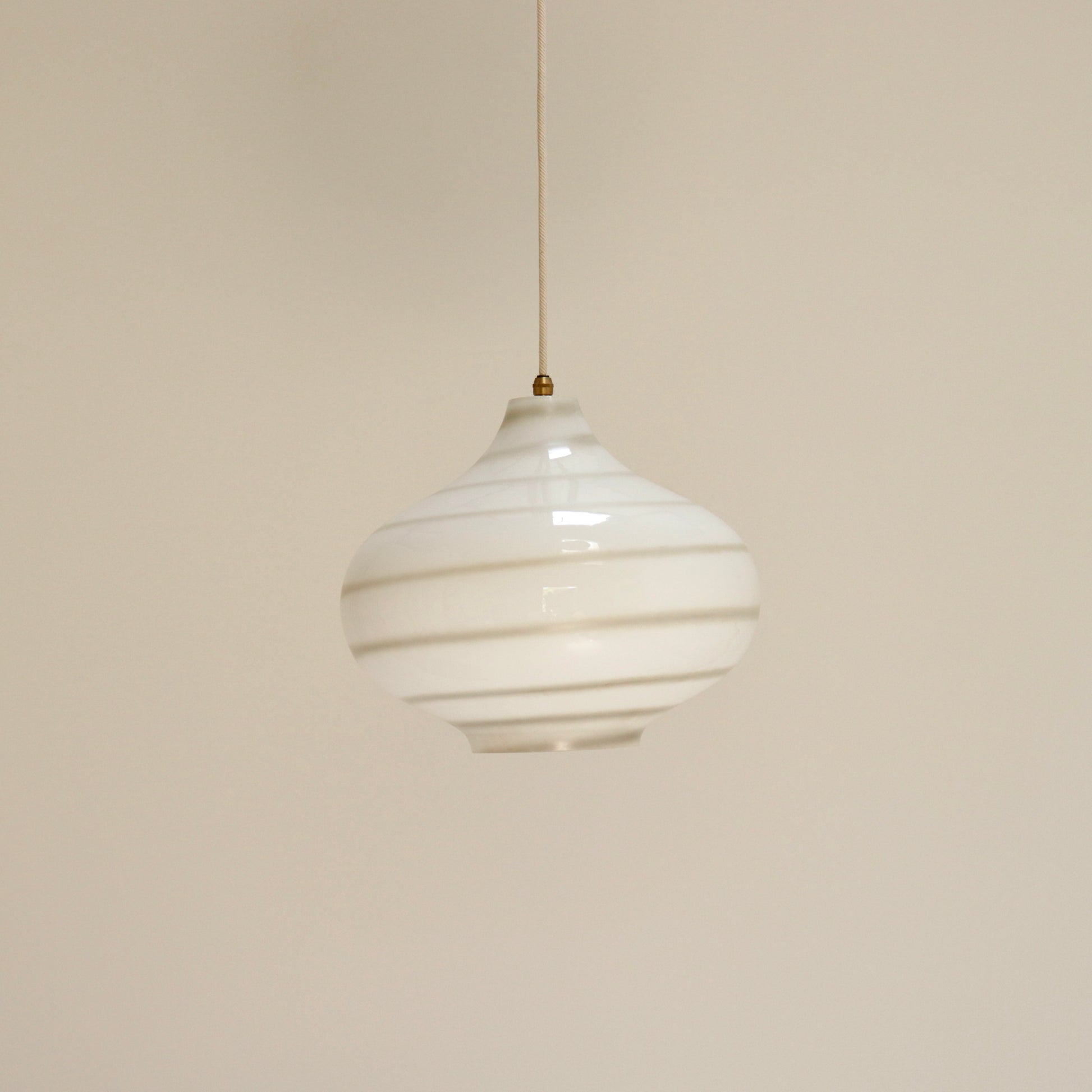 A beautifully minimal French pendant light with a distinctive spiral-moulded opaline glass shade. The surface twists gently in a continuous ribbon, catching and diffusing the light with subtle movement — more sculpture than fixture.