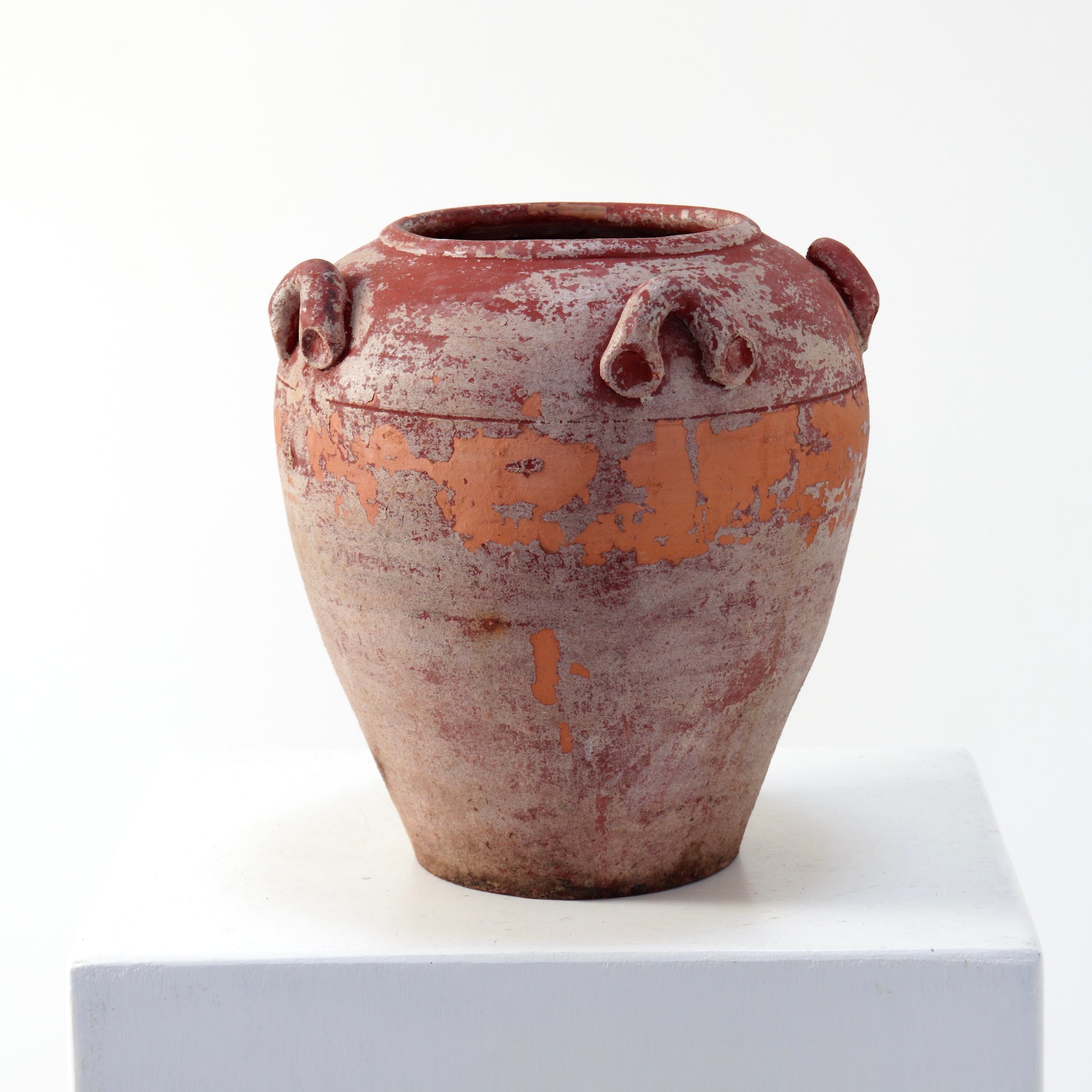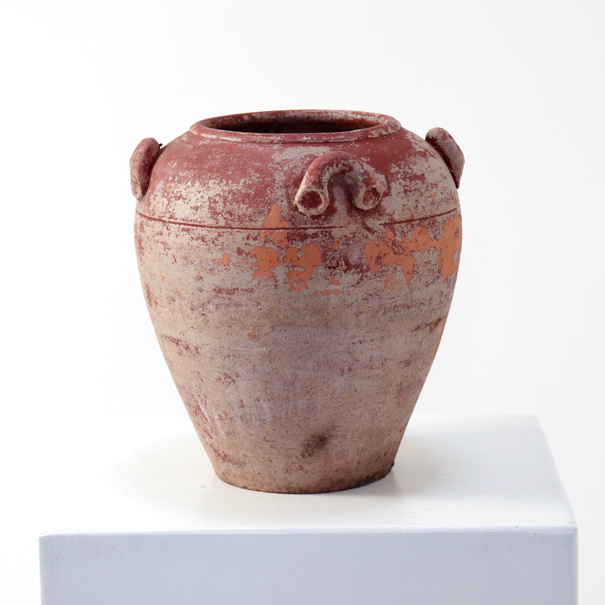 A beautiful old terracotta vessel with surface texture that only time served can conjure. The warm clay body is softened by layers of natural wear — remnants of slip, weather, and handling have left a mottled surface of faded red and ochre tones.