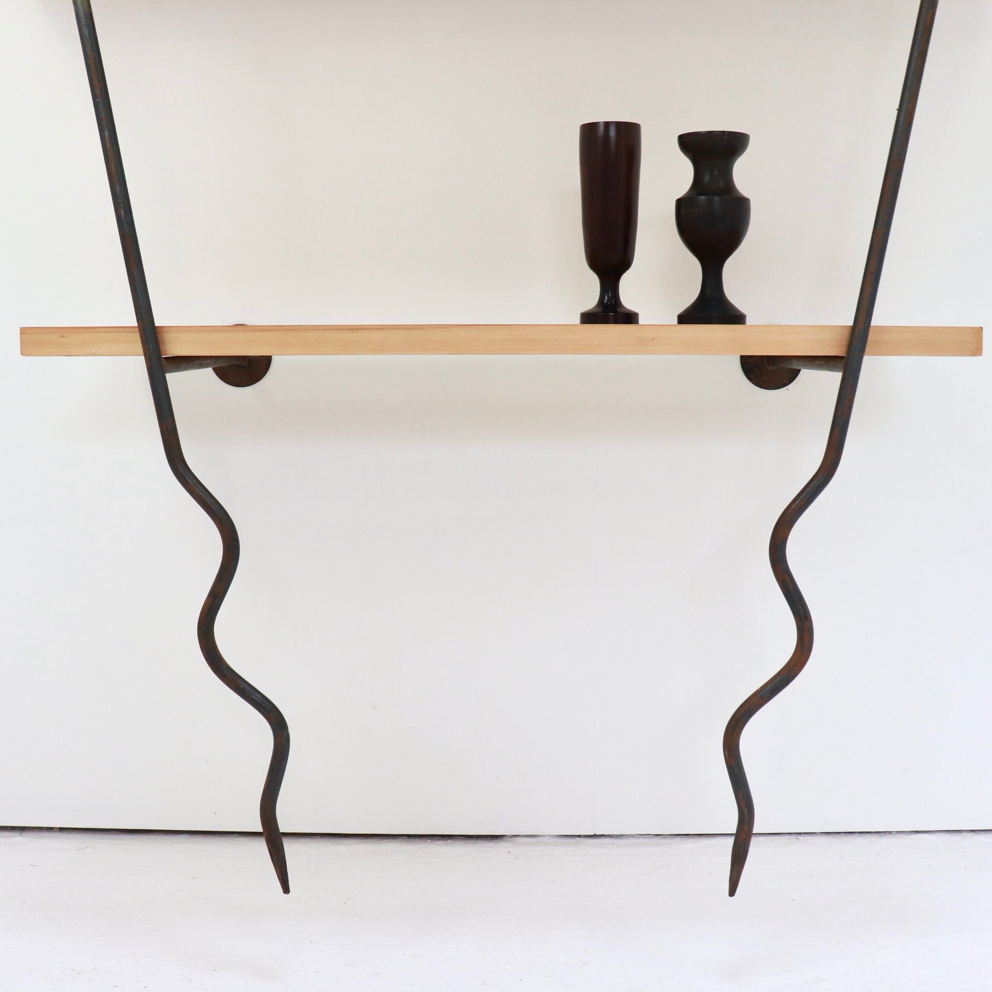 A piece of useful sculpture. Two hand-forged iron uprights climb the wall in slow, serpentine lines, tapering to hammered tips that feel almost totemic. Three solid timber shelves span between discreet round brackets, their simple planes setting off the expressive ironwork. The contrast is the charm: graphic and slender from a distance; up close you catch the hammer marks, the slight irregularities, the warm grain of the wood.